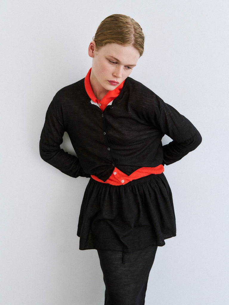 Knitted cardigan in double-layer fine merino wool, featuring a contrasting chalk inner layer that adds subtle volume. Designed with a slightly cropped silhouette, buttoned front, long sleeves with positional ruching, and rolled-edge trims.
