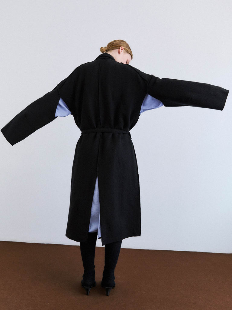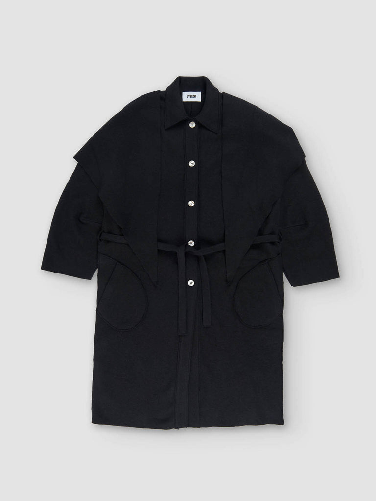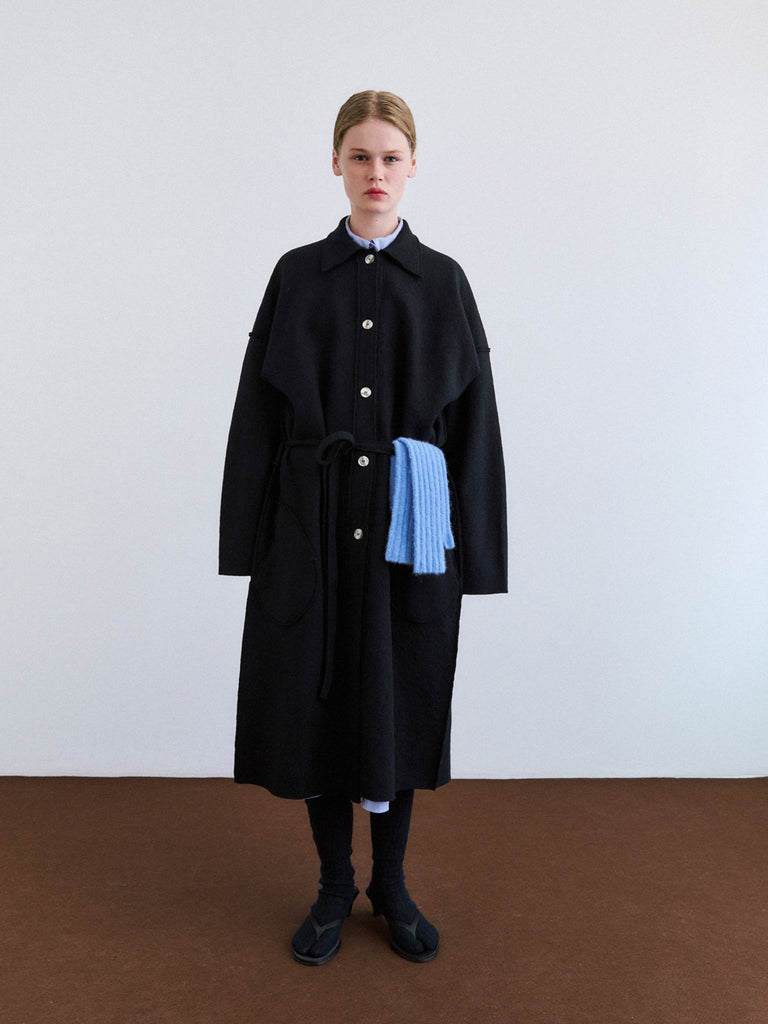 Buttoned coat featuring a detachable layered triangle scarf, crafted from boiled merino wool. Designed with a relaxed silhouette, it features dropped shoulders, exposed seams and curved sleeves. Back slit and armhole cutouts add versatility for ease of movement and multiple styling options.