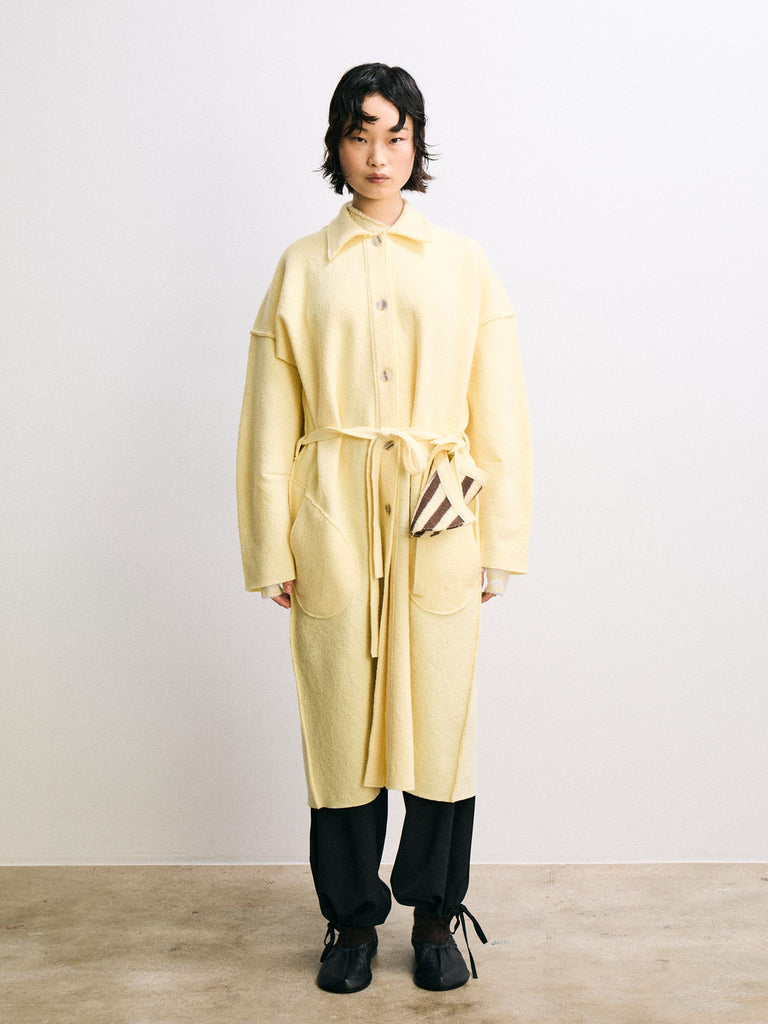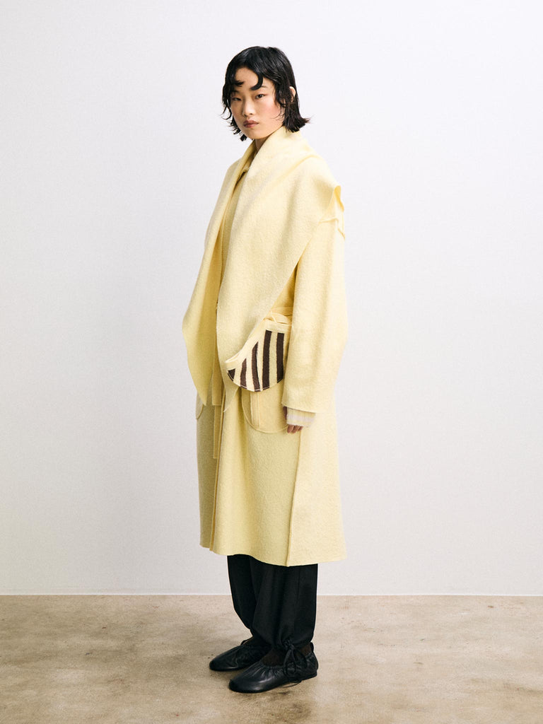 Felted merino wool coat Regular priceButtoned coat featuring a detachable layered triangle scarf, crafted from boiled merino wool. Designed with a relaxed silhouette, it features dropped shoulders, exposed seams and curved sleeves. Back slit and armhole cutouts add versatility for ease of movement and multiple styling options.