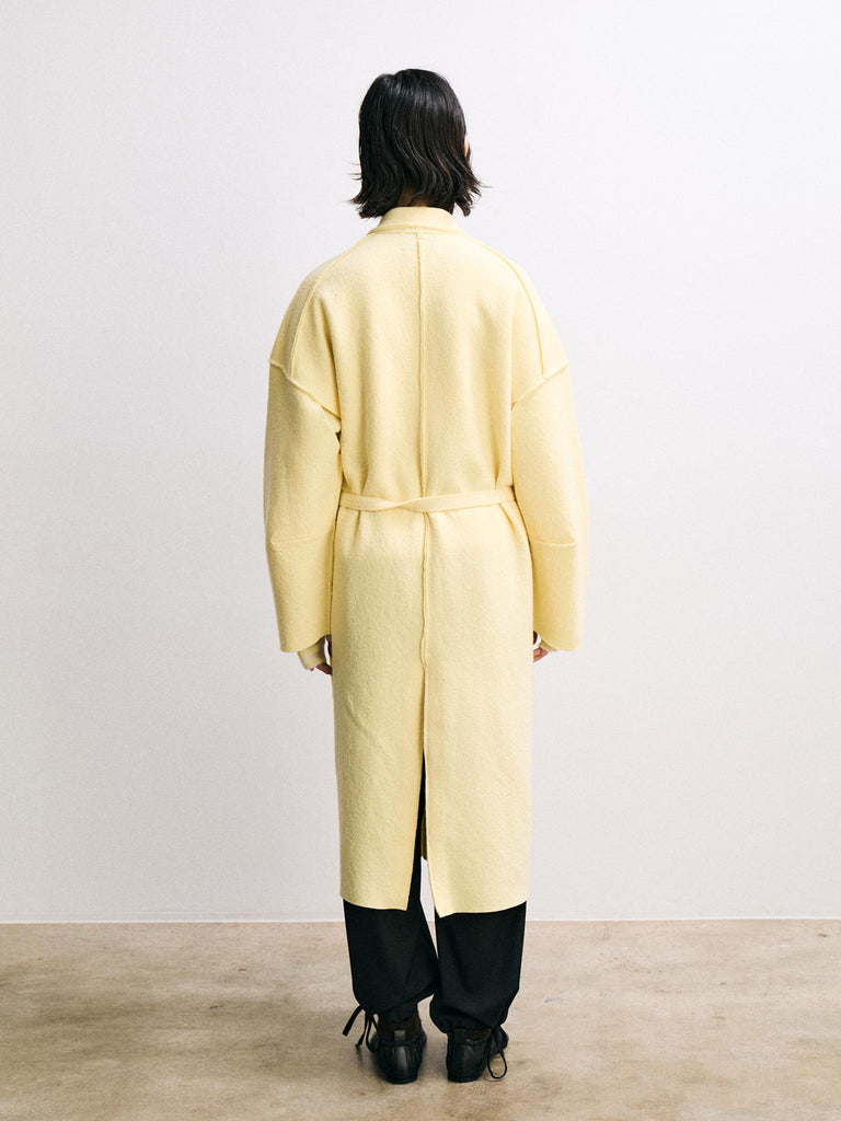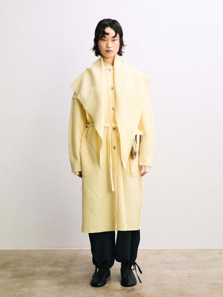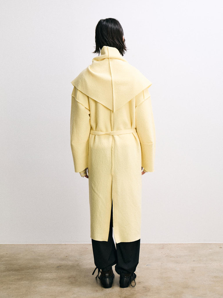 Buttoned coat featuring a detachable layered triangle scarf, crafted from boiled merino wool. Designed with a relaxed silhouette, it features dropped shoulders, exposed seams and curved sleeves. Back slit and armhole cutouts add versatility for ease of movement and multiple styling options.