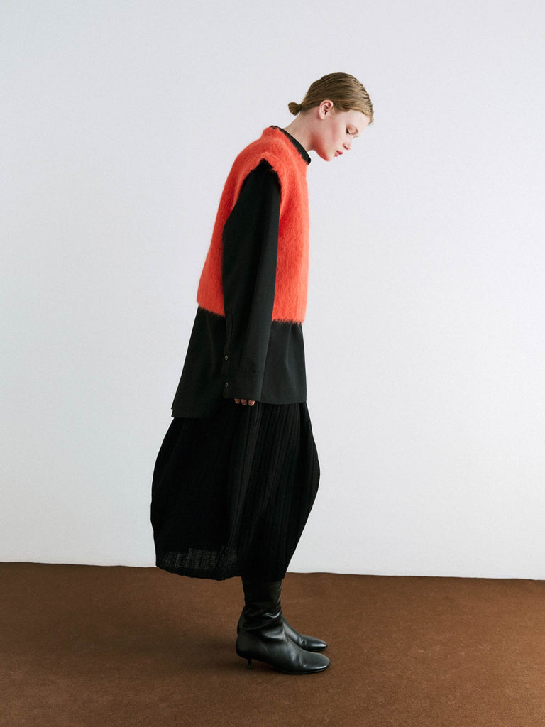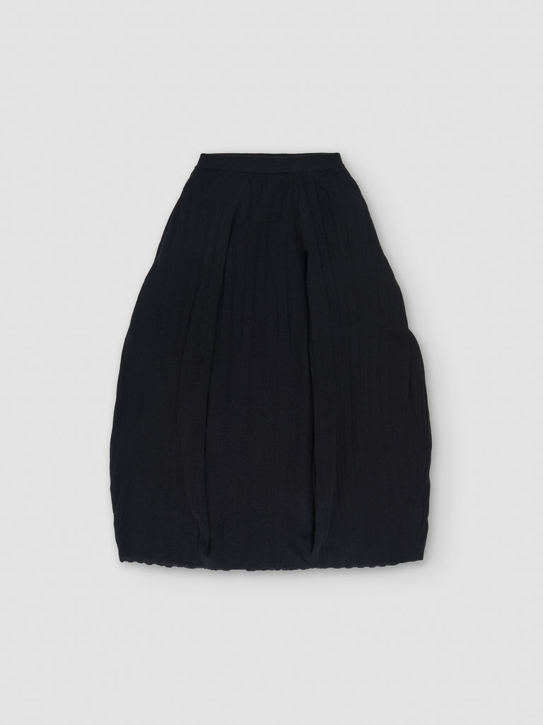 Balloon skirt Regular priceBalloon midi skirt knitted in a fine striped tonal jacquard, crafted from extrafine merino wool and makò cotton. Featuring a rounded panelled structure with side pockets and a ribbed elasticated waistband.