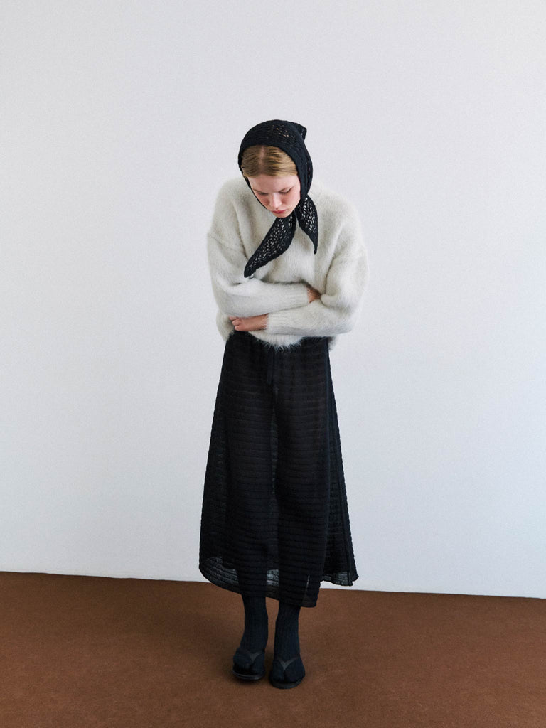 Flared semi-sheer fine-knit skirt in a blend of fine merino wool and Makò cotton. Designed with a textured two-tone knit that creates an all-over pleated effect, finished with a ribbed elasticated waistband and adjustable ties.