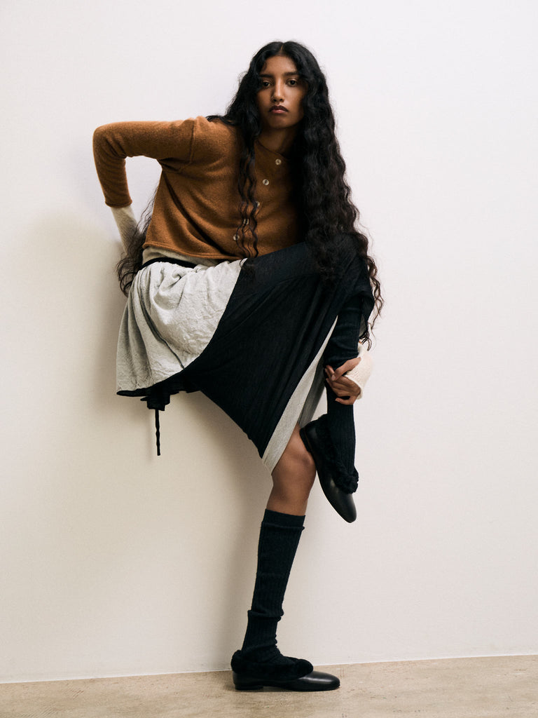 Buttoned cardigan Regular priceMock-neck cardigan with exposed seams knitted from a soft baby alpaca-cashmere blend. Slightly cropped fit featuring a buttoned front, dropped shoulders and wrist-length sleeves.