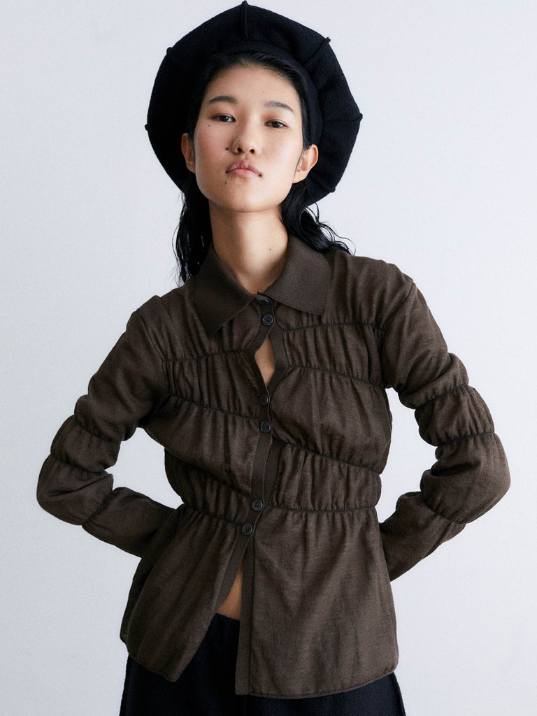 Ruched wool shirt Regular priceKnitted cardigan featuring irregular positional ruching and crafted in a double-layer fine merino wool with a contrasting chalk inner layer for subtle volume. Finished with a pointed collar, long sleeves, rolled trims, and a button-down front.