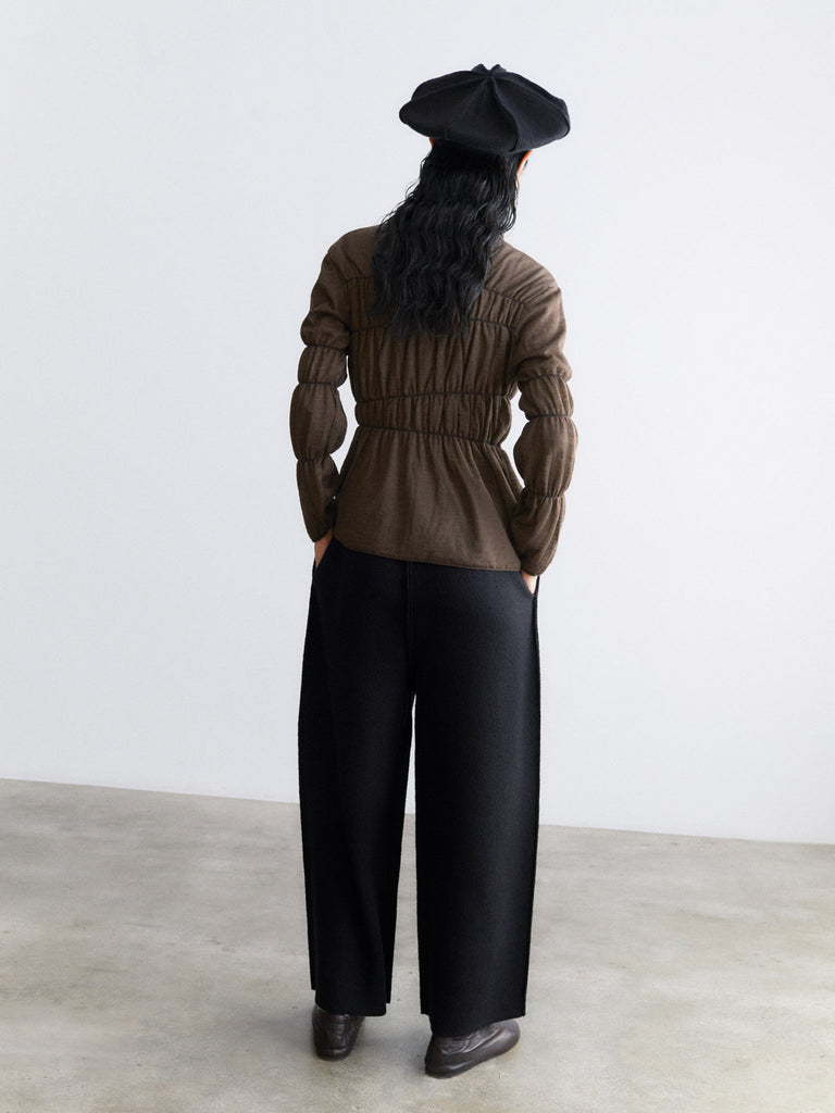 Knitted cardigan featuring irregular positional ruching and crafted in a double-layer fine merino wool with a contrasting chalk inner layer for subtle volume. Finished with a pointed collar, long sleeves, rolled trims, and a button-down front.