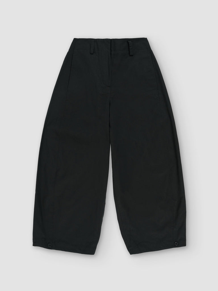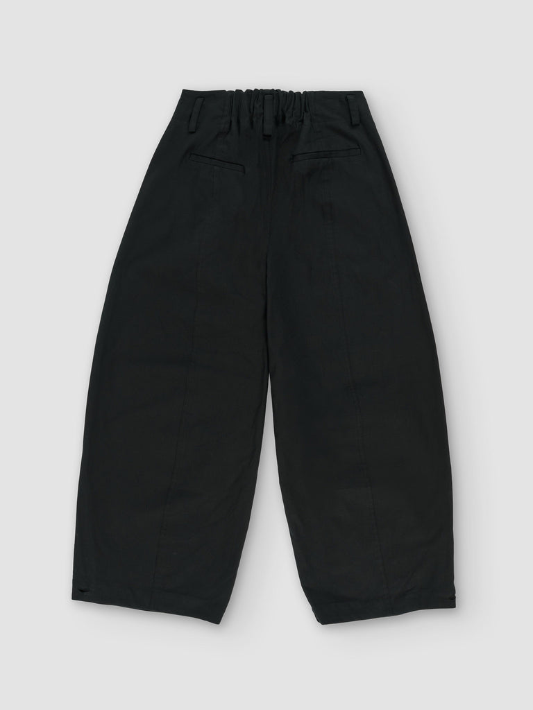Wide-leg pants crafted from a cotton and linen blend. Designed for a relaxed, ample fit with a curved outseam. Featuring a front zip closure, partially elasticized waistband, side and back pockets, and an adjustable hem for customizable styling.