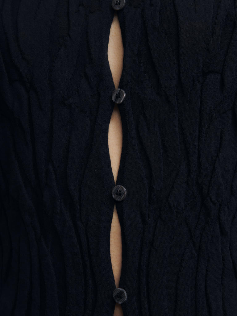Organic cotton textured top Regular priceLightweight sleeveless top crafted from organic cotton, knitted in a textured stitch for a subtle, irregular pleated effect throughout. Features a straight fit with exposed seams, a pointed collar, and a button-down front with closely spaced buttons that subtly reveal what’s underneath.