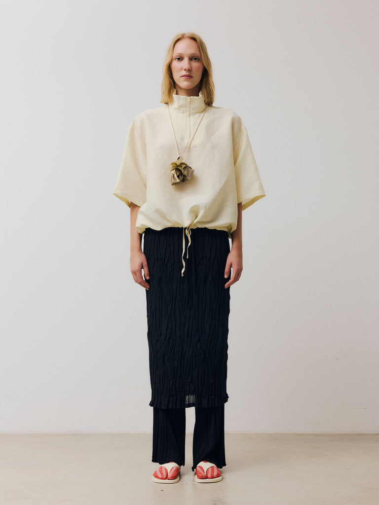 Lightweight midi skirt crafted from organic cotton, knitted in a textured stitch for a subtle, irregular pleated effect throughout. Features an elasticated waistband with adjustable ties and a detachable lining for versatile styling.