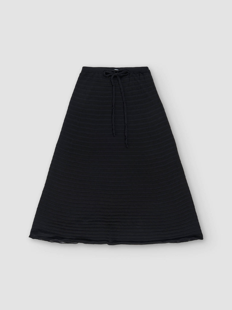 Flared semi-sheer fine-knit skirt in a blend of fine merino wool and Makò cotton. Designed with a textured two-tone knit that creates an all-over pleated effect, finished with a ribbed elasticated waistband and adjustable ties.