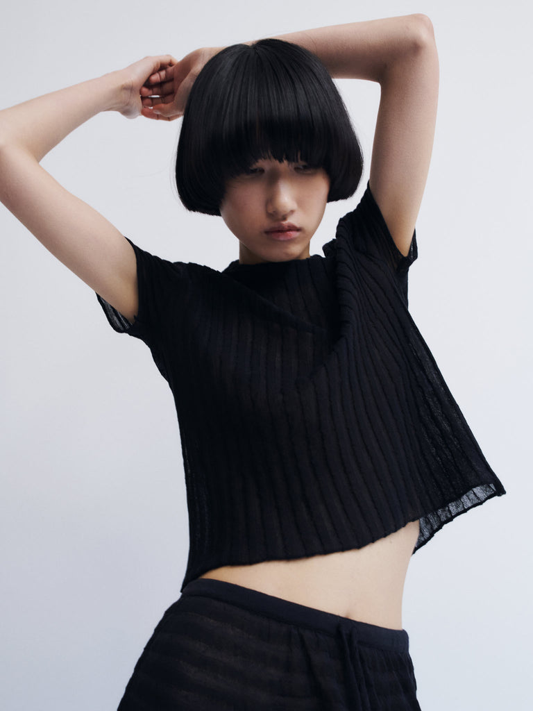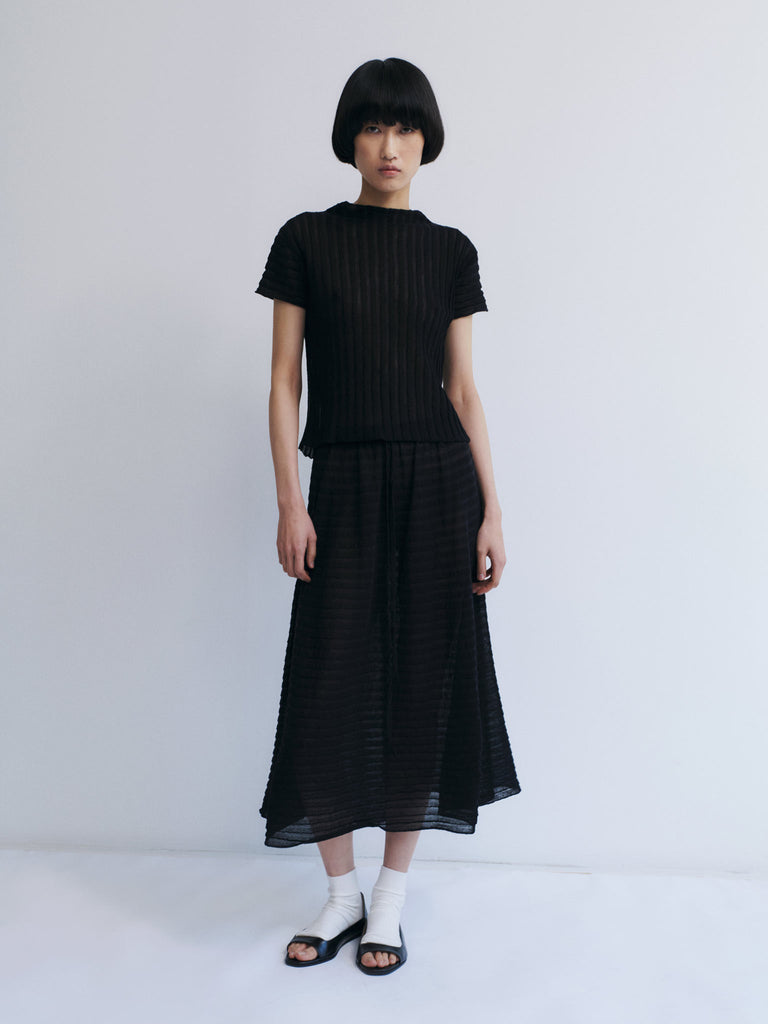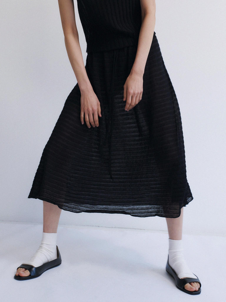 Semi-sheer pleated skirt Regular priceFlared semi-sheer fine-knit skirt in a blend of fine merino wool and Makò cotton. Designed with a textured two-tone knit that creates an all-over pleated effect, finished with a ribbed elasticated waistband and adjustable ties.