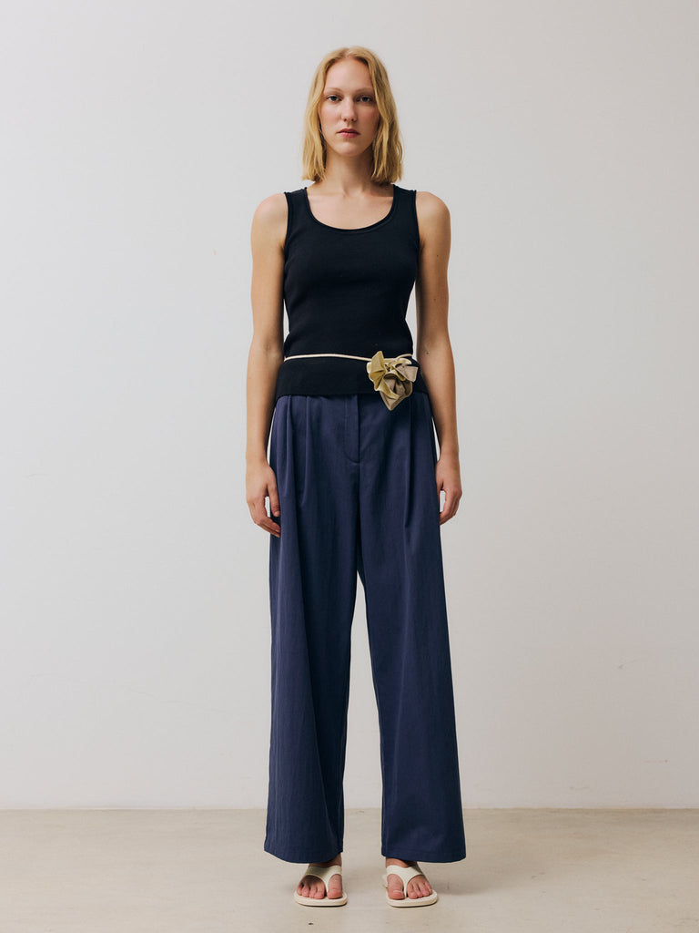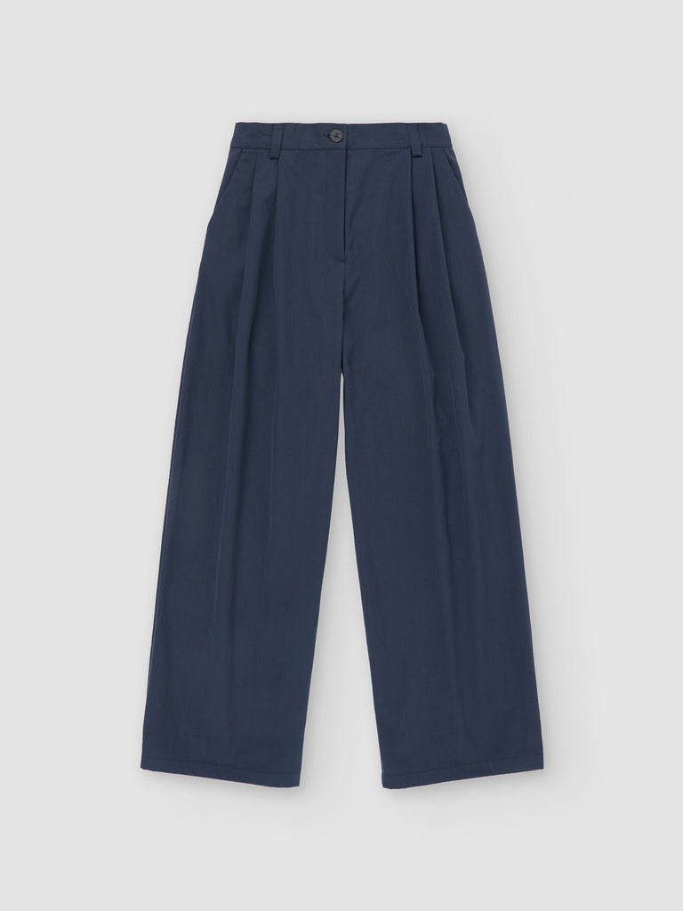 Wide-leg straight pants featuring a deep double pleat at the waist. Designed with two side pockets, two back welt pockets, belt loops, a front zip closure, and a partially elasticized waistband.