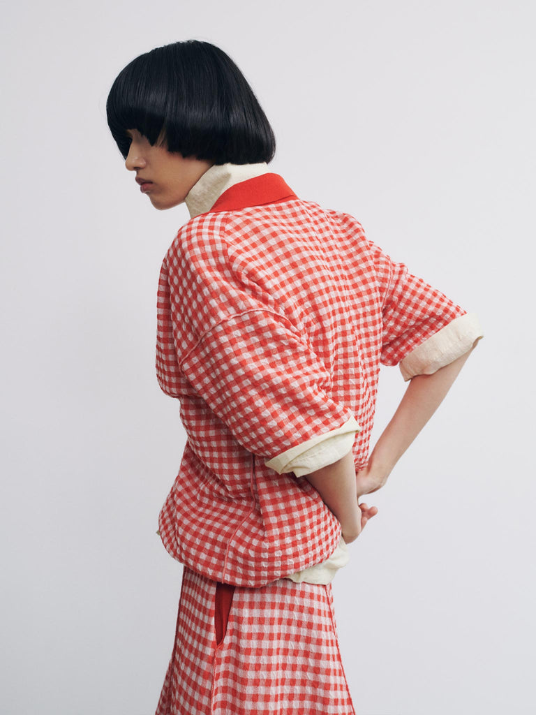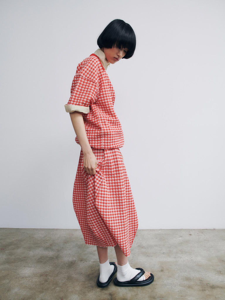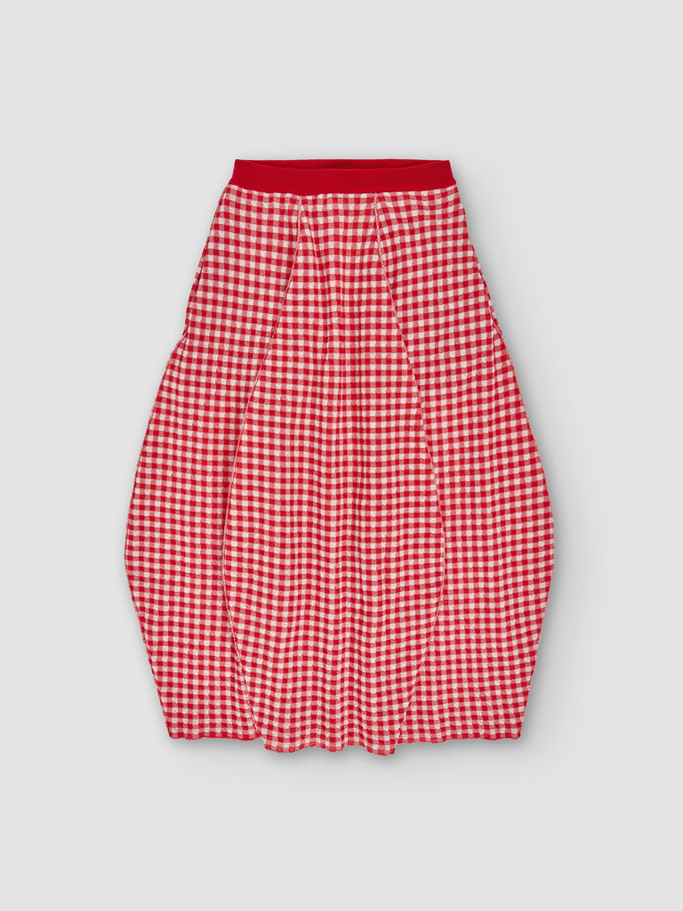 Balloon gingham skirt Regular priceBalloon midi skirt crafted in a lightweight gingham two-tone textured jacquard, knitted from ultrafine makò cotton. Rounded panelled structure featuring exposed seams, side pockets and a ribbed elasticated waistband.