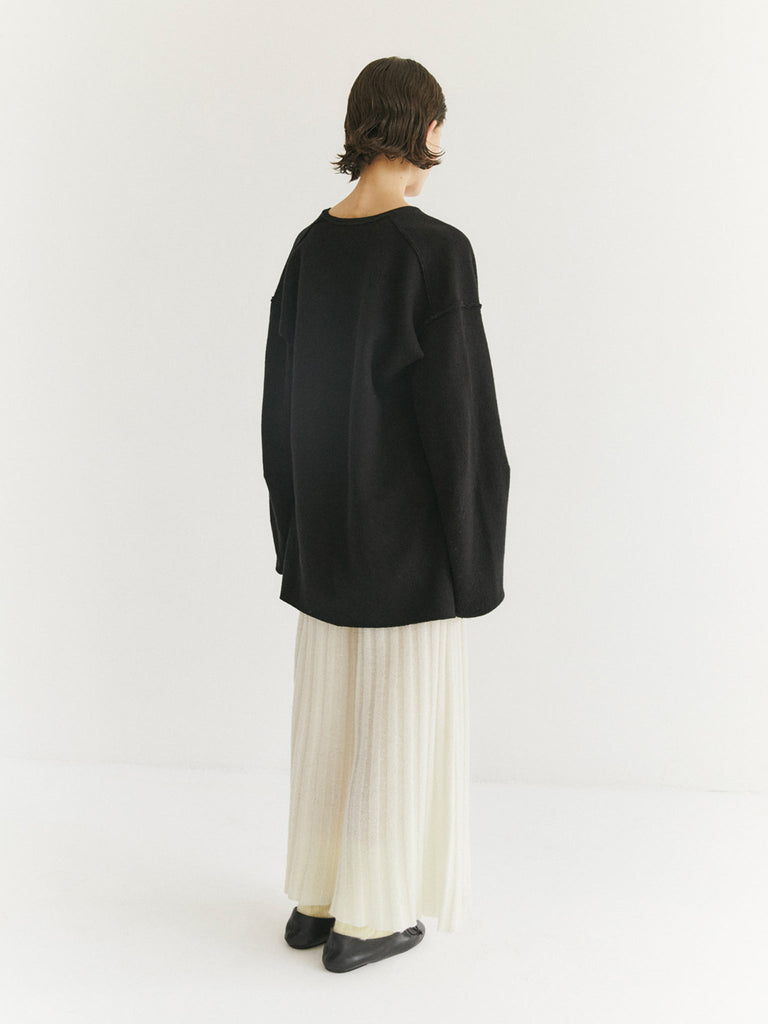 This felted wool effect is achieved simply by washing the knit with warm water, which causes the wool fiber to shrink and felt while keeping its original softness and lightness. Merino wool is known for extreme softness on skin since its fibers are much finer than other types of breeds, enabling them to bend more. It is a completely renewable fiber source, naturally breathable and anti-bacterial. Our merino wool is sourced from Australian merino sheep and later spun in Italy by the most experienced mills, who ensure the animal health and welfare in mostly family owned and operated farms.