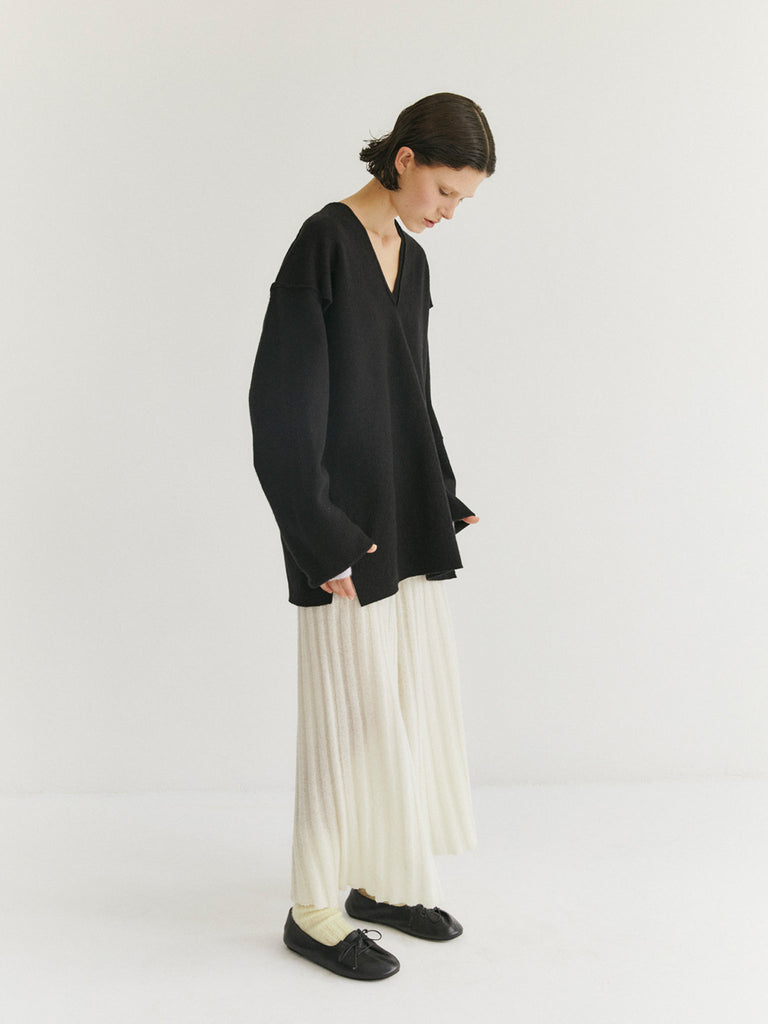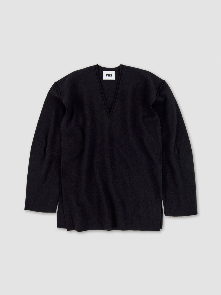 Elongated v-neck sweater knitted from boiled merino wool. Featuring deep side splits, exposed seams, curved sleeves and armhole cut outs for ease of movement and alternate styling.