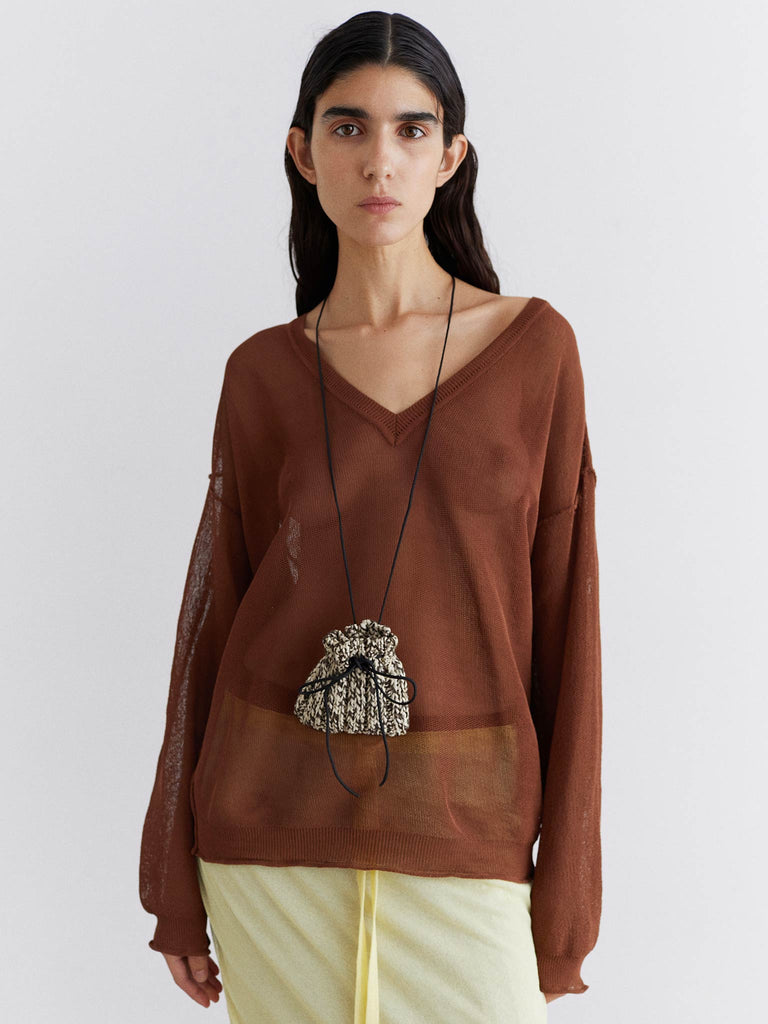 Boxy v-neck sweater crafted from a corded organic cotton yarn with a dry handfeel in a mesh texture. Featuring a relaxed silhoutte with a deep ribbed v-neck and rolled ribbed trims.