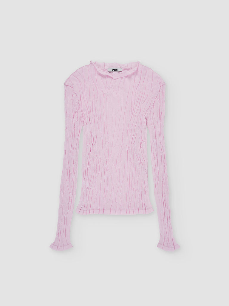 Lightweight long-sleeved sweater crafted from organic cotton, knitted in a textured stitch for a subtle, irregular pleated effect throughout. Features a form-fitting silhouette with exposed seams, a seamless neck, and skinny, elongated sleeves. Perfect for layering or wearing on its own.