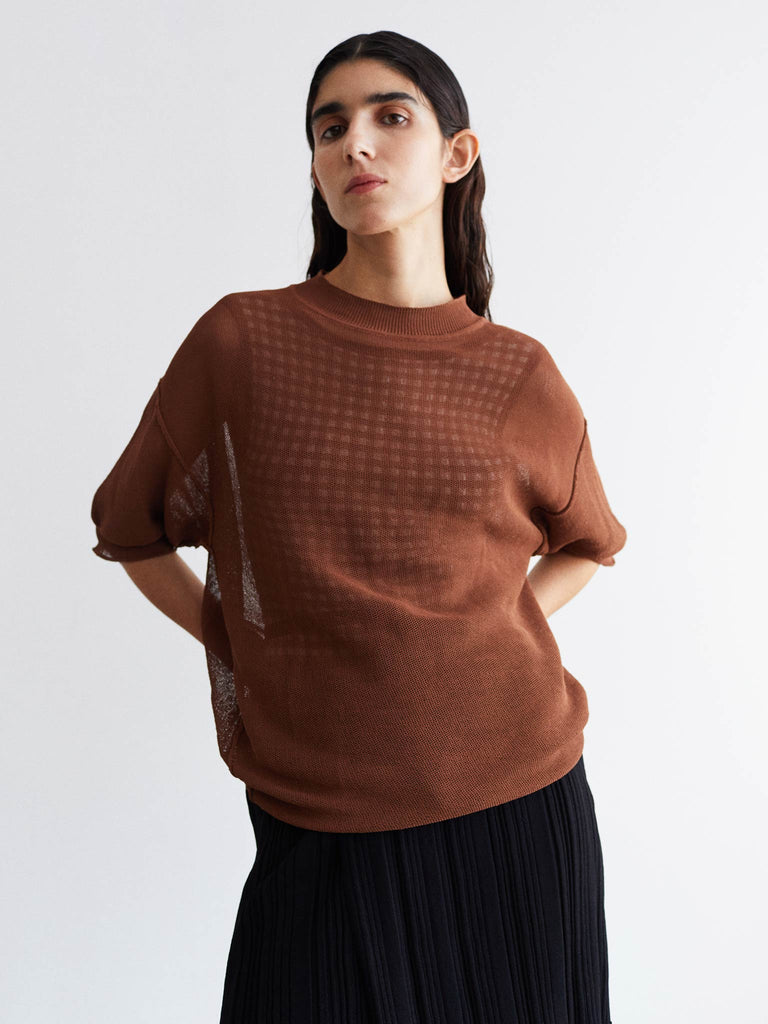 Mesh short-sleeved top Regular priceSemi-sheer short-sleeved top crafted from a corded organic cotton yarn with a dry handfeel in a mesh texture. Relaxed elongated silhouette with short and ample sleeves, exposed seams and ribbed trims.