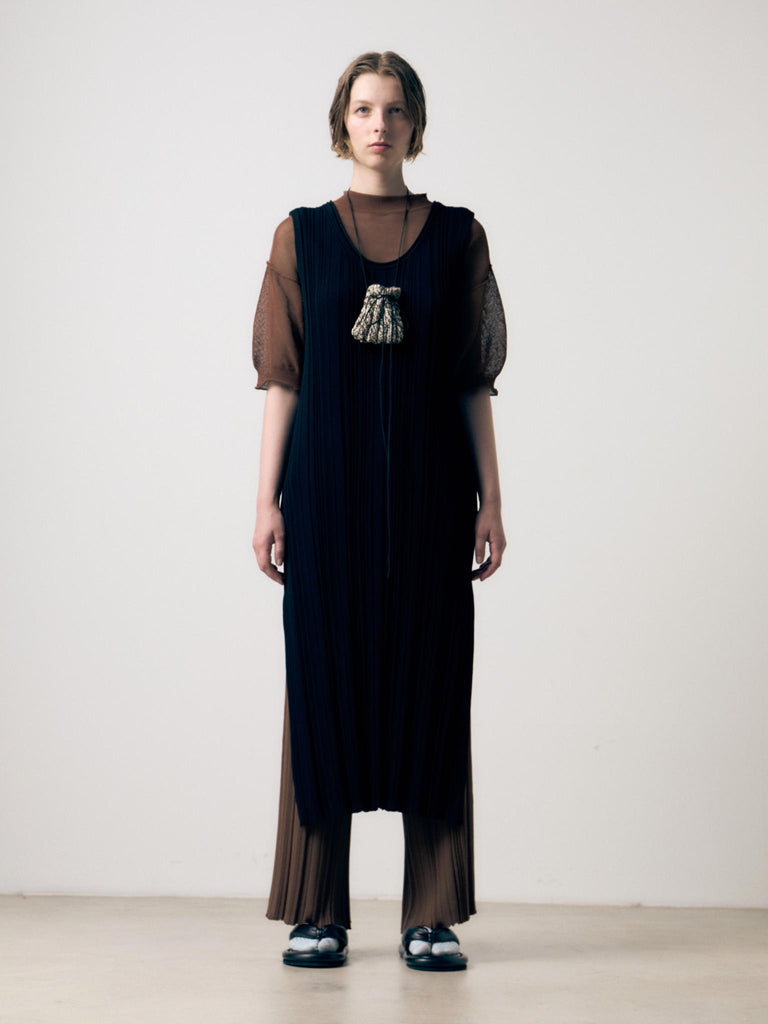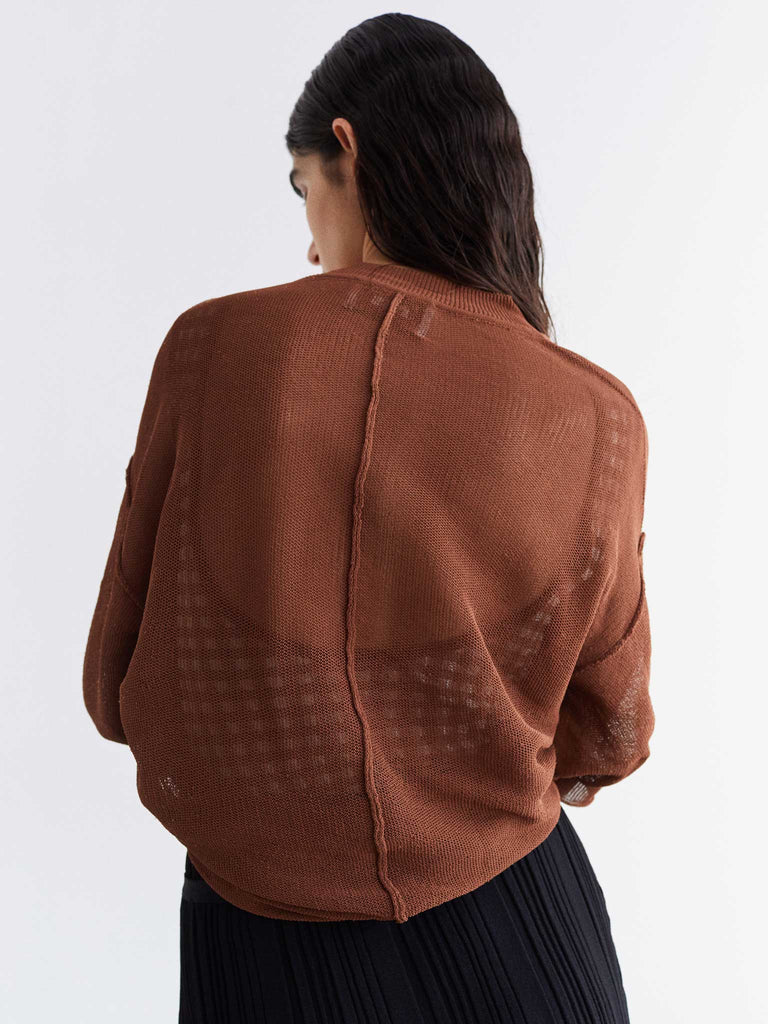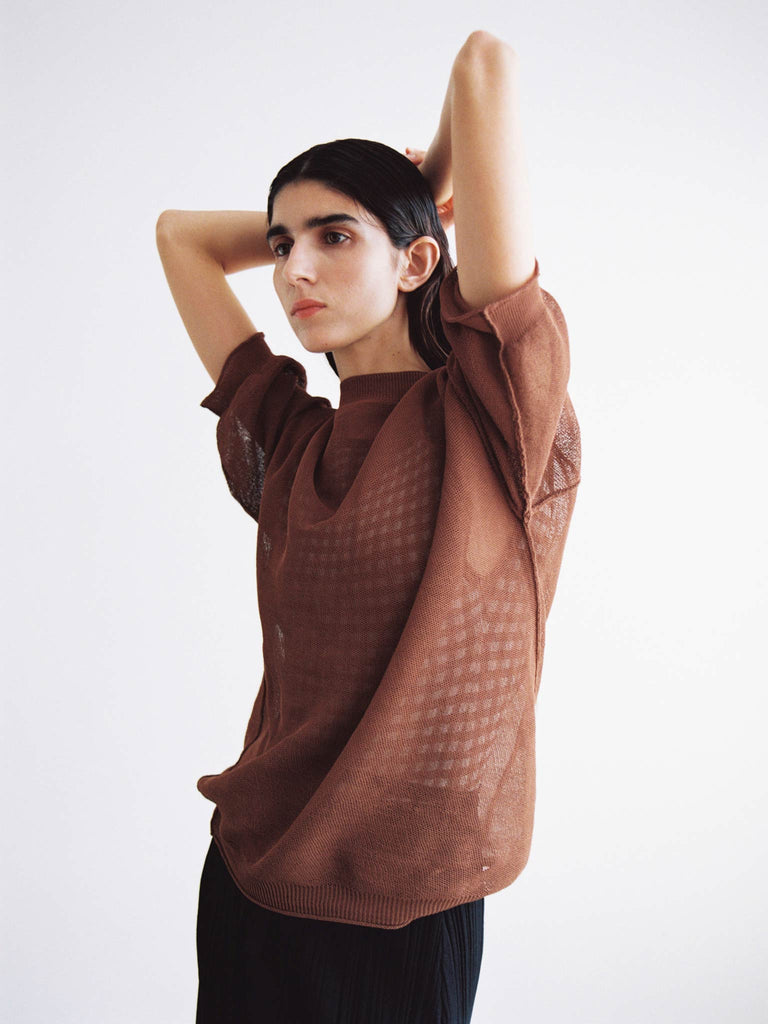 Semi-sheer short-sleeved top crafted from a corded organic cotton yarn with a dry handfeel in a mesh texture. Relaxed elongated silhouette with short and ample sleeves, exposed seams and ribbed trims.
