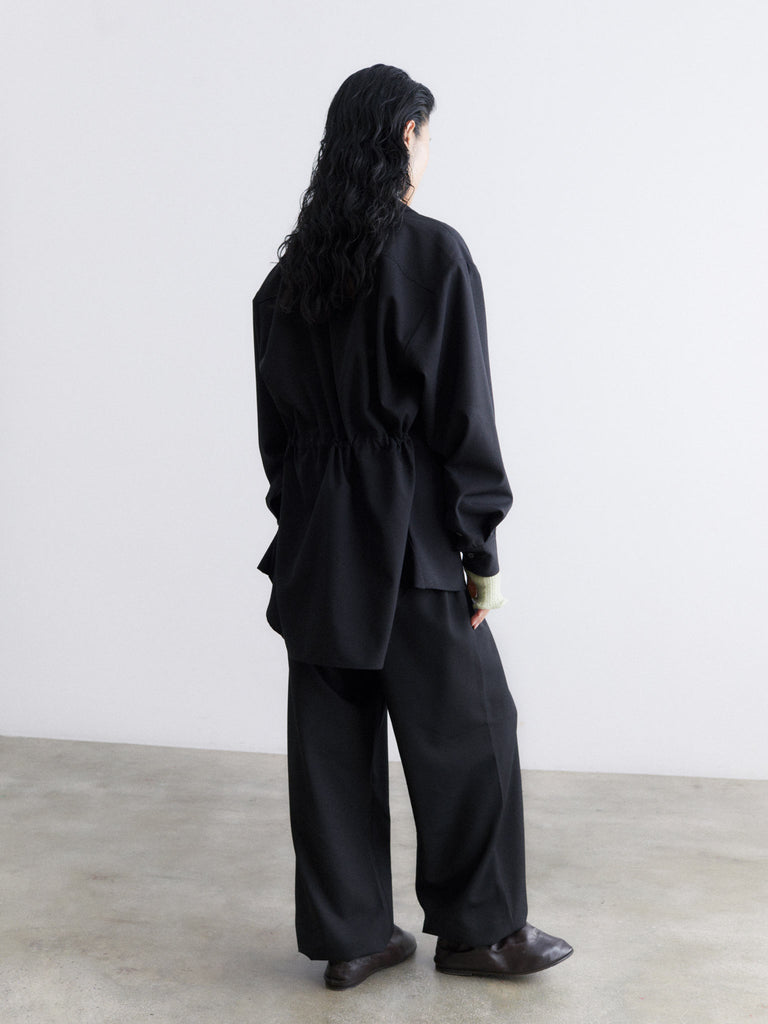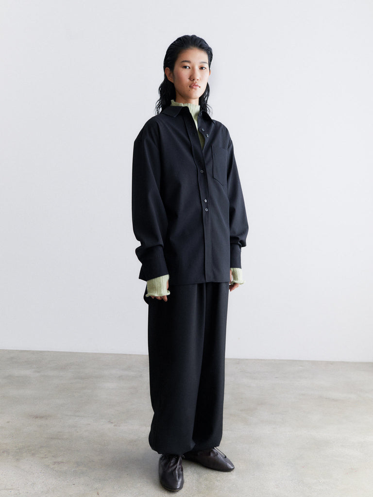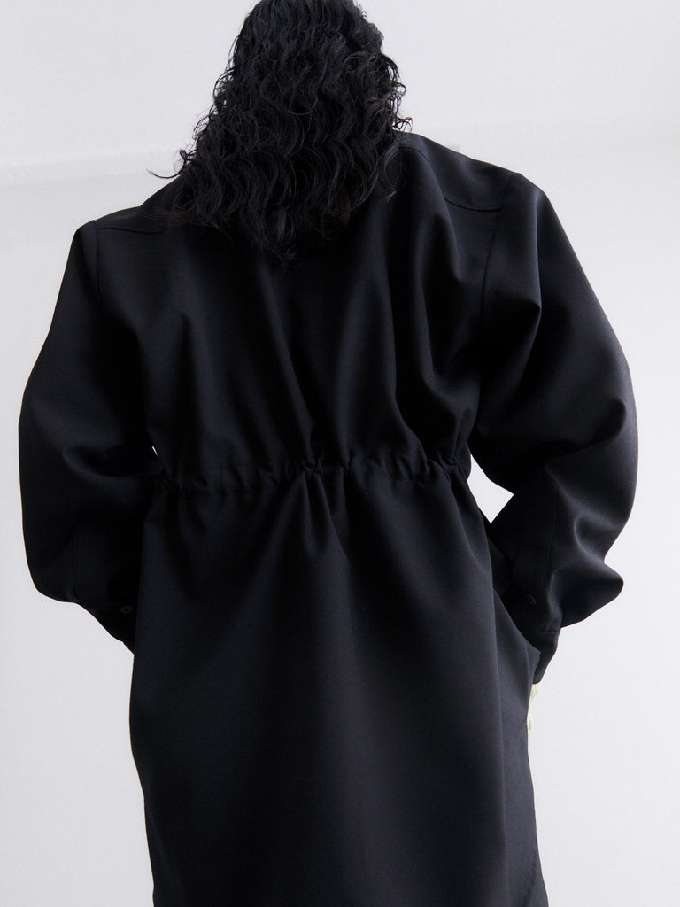 Long-sleeved oversized shirt crafted from a lightweight and breathable wool blend fabric. It features a relaxed fit, dropped shoulders, and falls below the hip. An inner back drawstring allows you to adjust the fit, creating either a loose or more defined silhouette. Finished with a pointed collar and full-length button-down front.