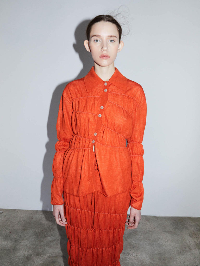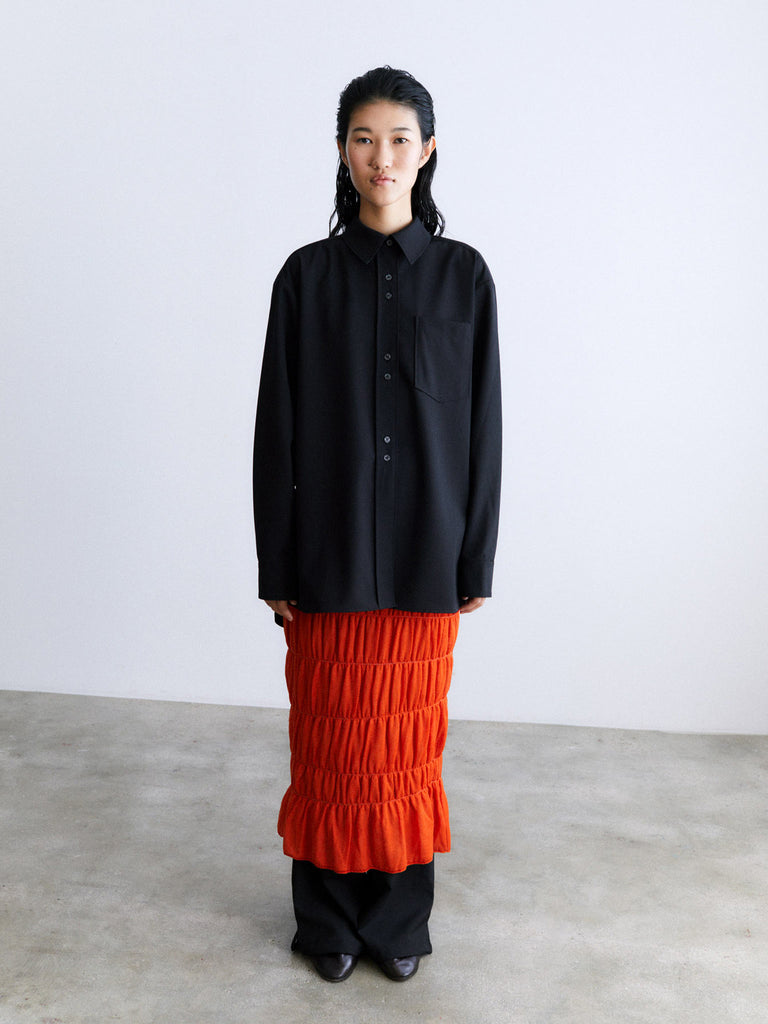 Midi ruched skirt Regular priceMidi skirt featuring irregular positional ruching and crafted in a double-layer fine merino wool with a contrasting chalk inner layer adding subtle volume. Finished with an elasticated waistband with knitted drawstring ties and rolled trims.