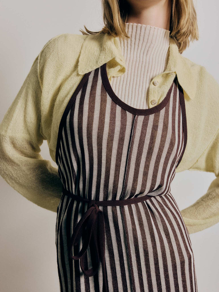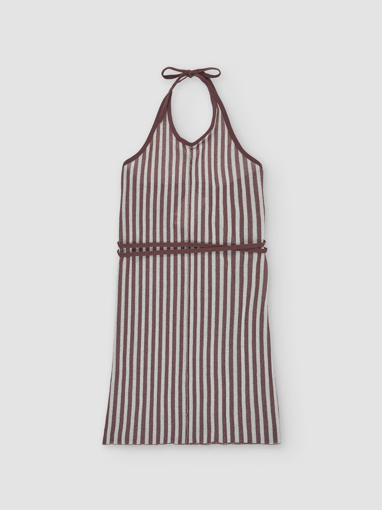 Striped apron dress Regular priceWrap-around apron dress in a fine striped jacquard crafted from ultrafine makò cotton. Features a straight fit with a scoop neck, self-tie halter strap, and wrap construction with a self-tie closure. Finished with an open back and a slit detail at the back. Perfect for layering or to wear on its own.