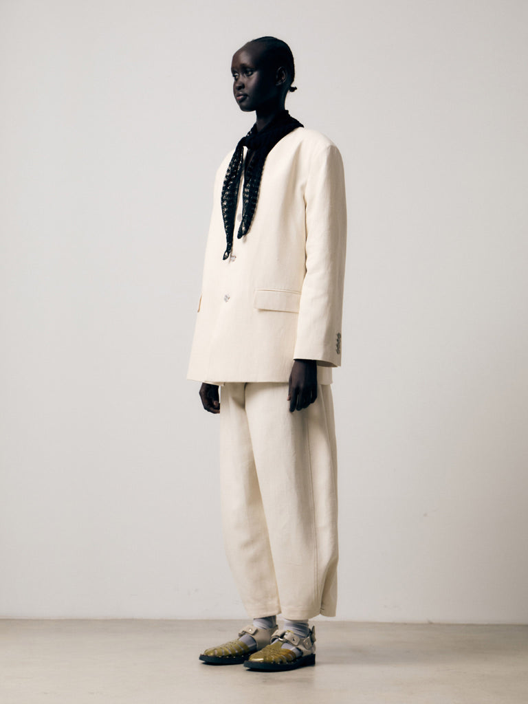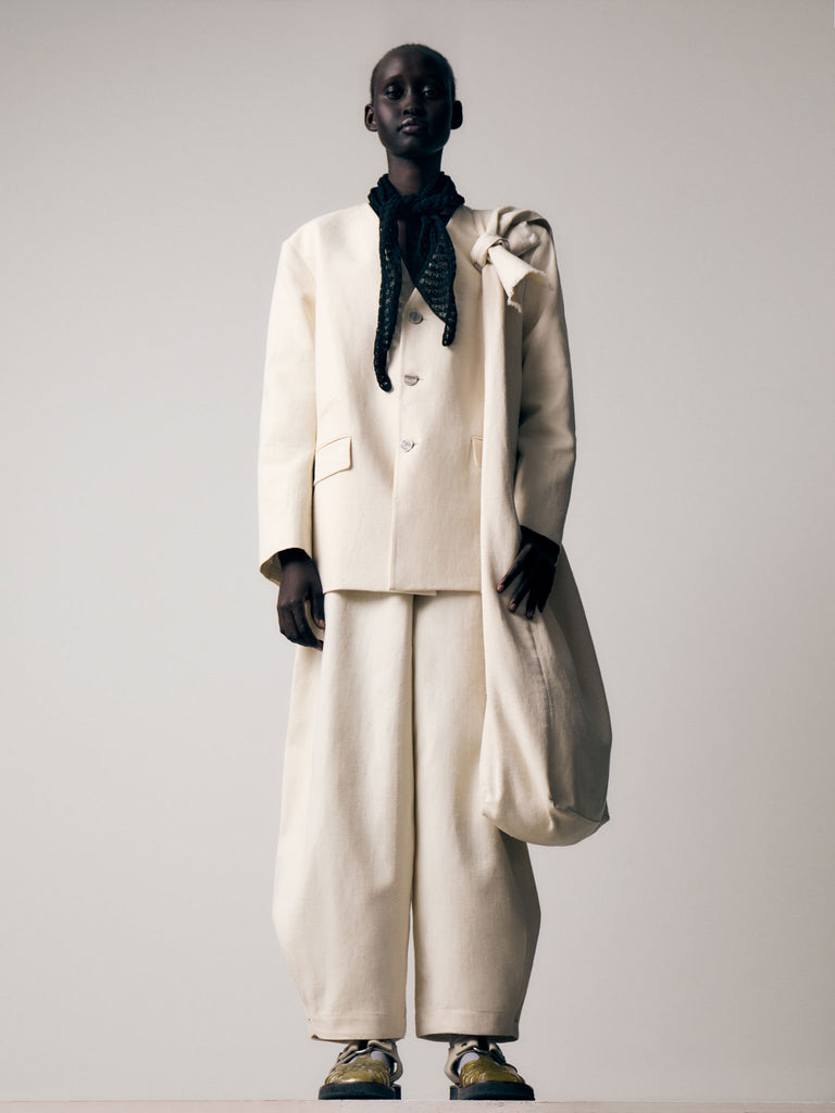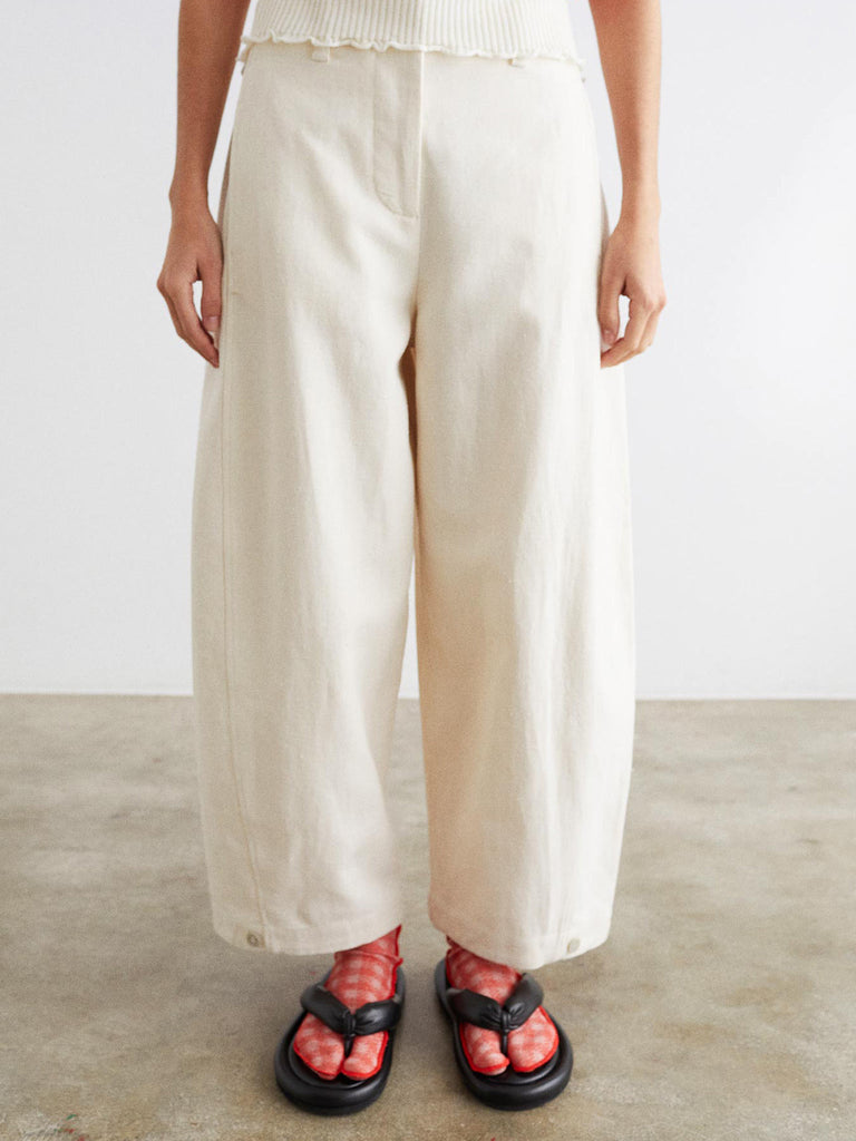 Curved leg pants Regular priceWide-leg pants crafted from a textured blend of recycled cotton and linen. Designed for a relaxed, ample fit with a curved outseam. Featuring a front zip closure, partially elasticized waistband, side and back pockets, and an adjustable hem for customizable styling.