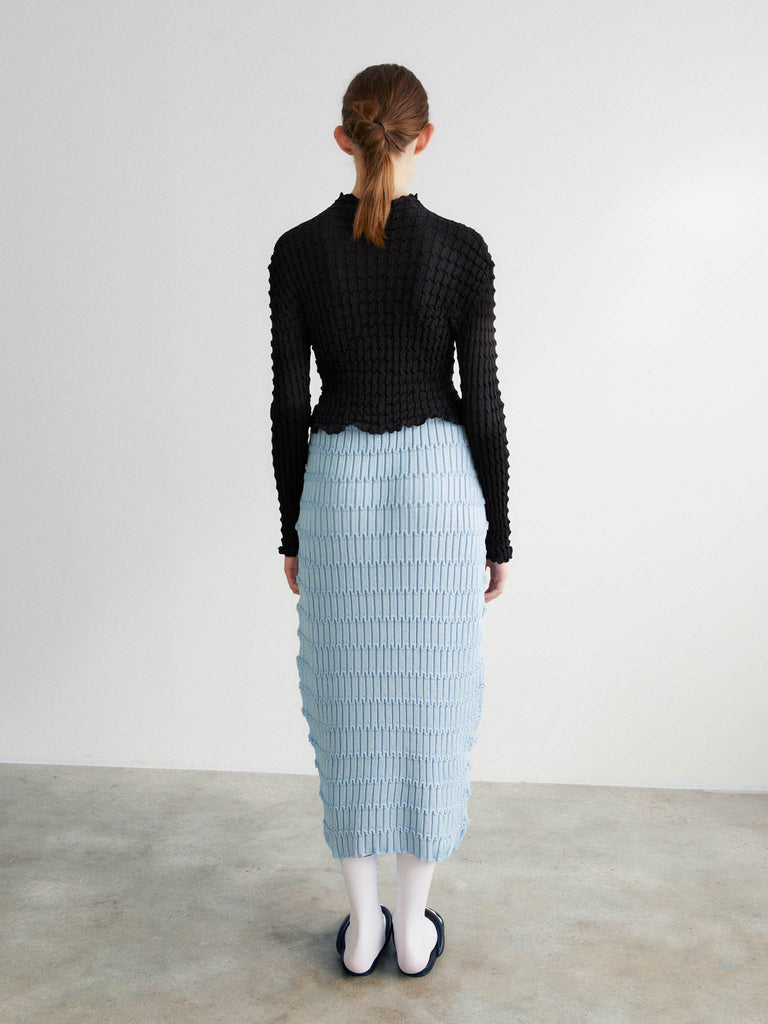 Lightweight knit crafted from a ultrafine makò cotton blend with a dry handfeel using wholegarment technology. Featuring a textured ribbed stitch that creates a pleated look all over, cropped hem, mock neck, rolled trims and slightly elongated skinny sleeves.