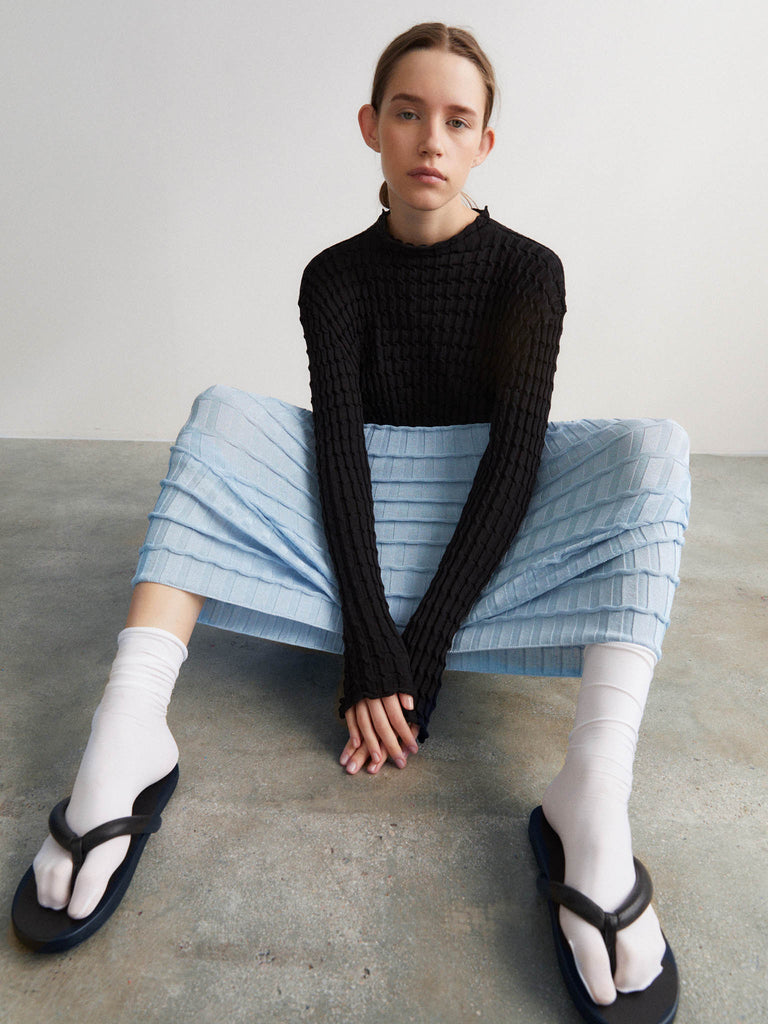 Pleated crop sweater Regular priceLightweight knit crafted from a ultrafine makò cotton blend with a dry handfeel using wholegarment technology. Featuring a textured ribbed stitch that creates a pleated look all over, cropped hem, mock neck, rolled trims and slightly elongated skinny sleeves.