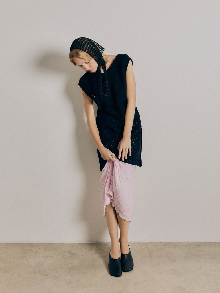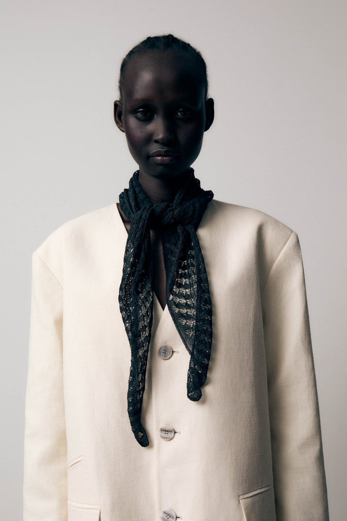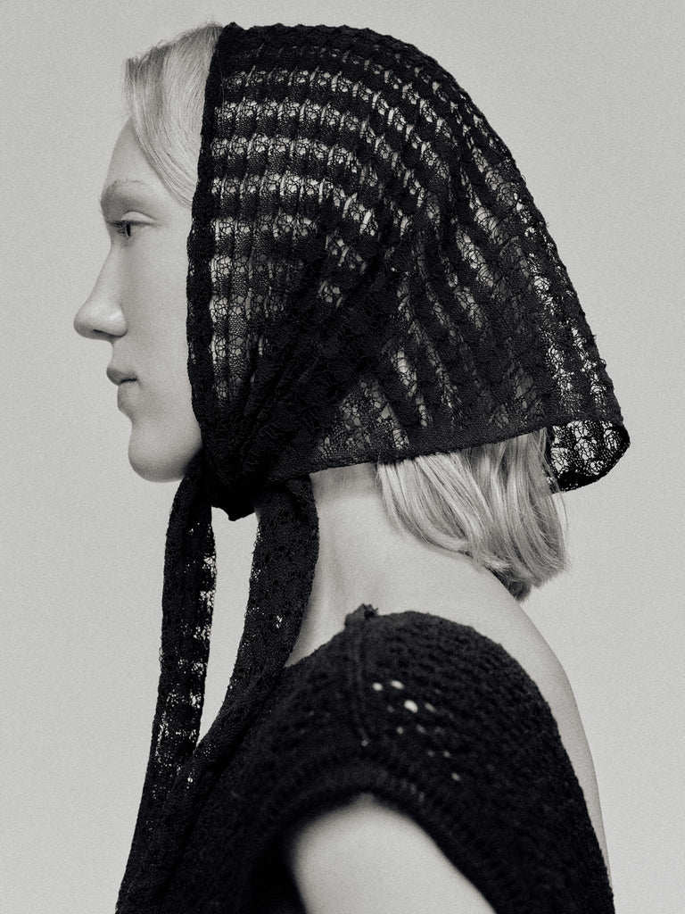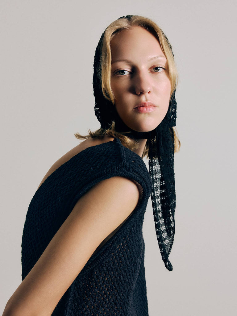 Triangle neck scarf knitted a lace-like open stitch from a corded organic cotton yarn with a dry handfeel