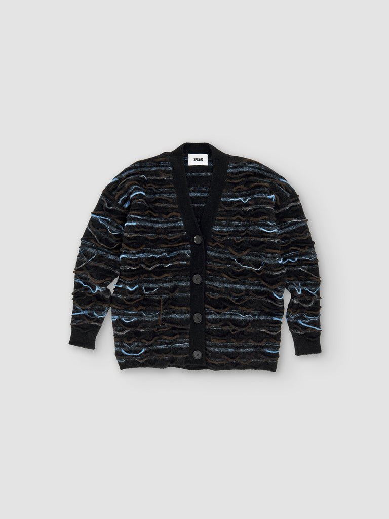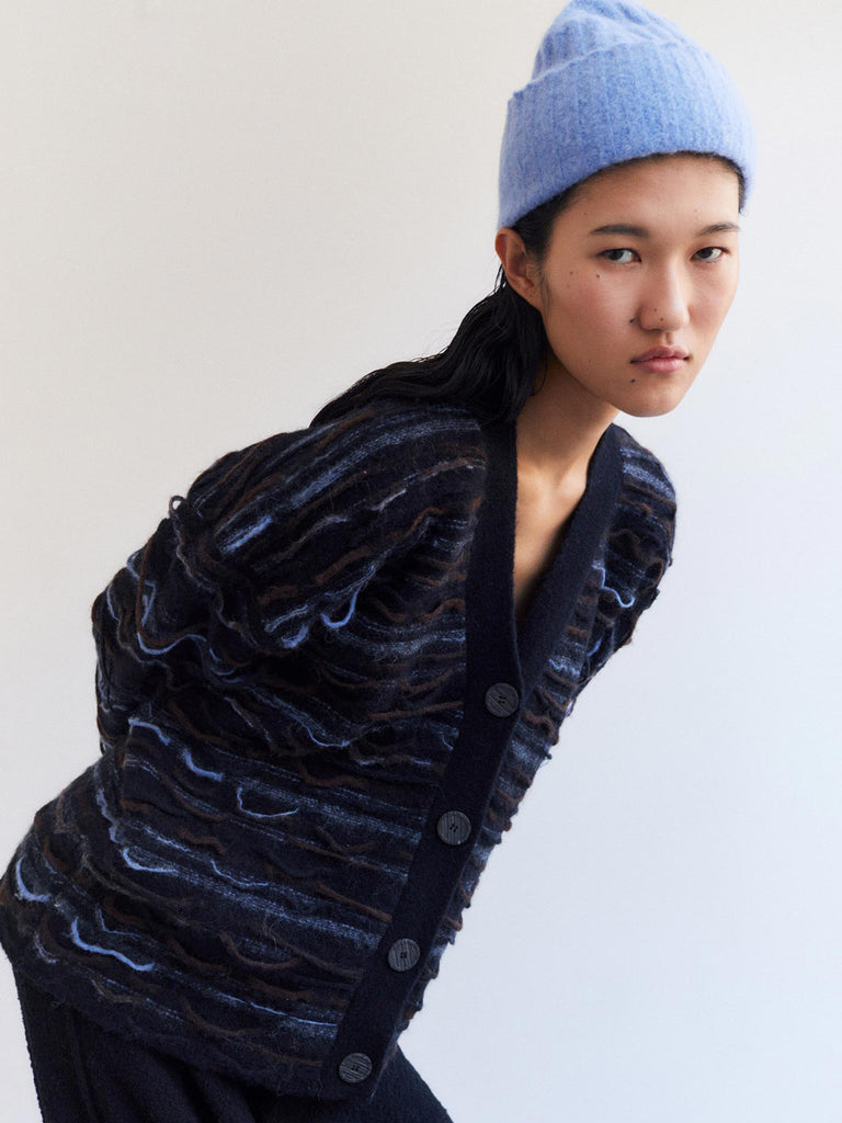 Multicolor frayed cardigan Regular priceMulticolor frayed cardigan crafted from a soft and fuzzy baby alpaca blend featuring a reversed weaving motif with loose threads. Relaxed boxy silhouette featuring a ribbed collar, cuffs and hem.