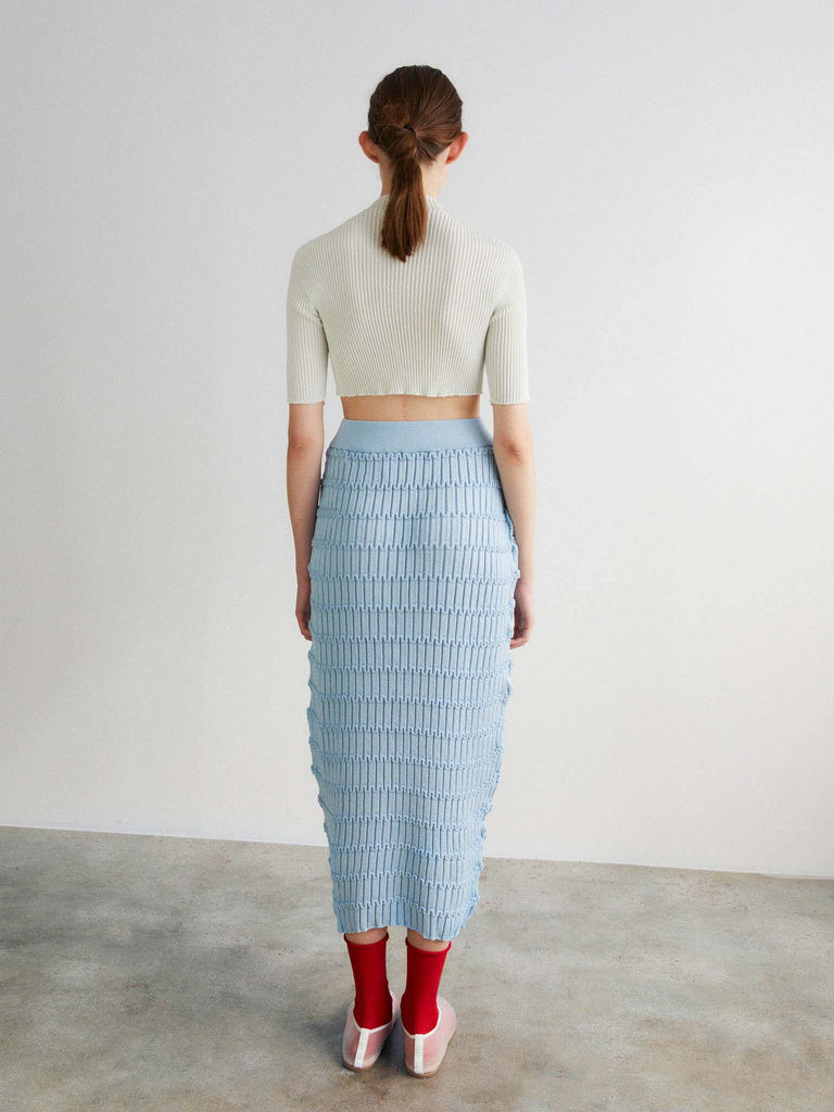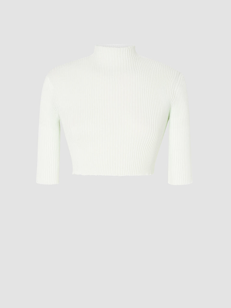 Ribbed second-skin knit crafted from a ultrafine makò cotton blend with a dry handfeel. Featuring a cropped silhouette, seamless mock-neck, fitted body and skinny sleeves. Crafted with whole-garment technology.