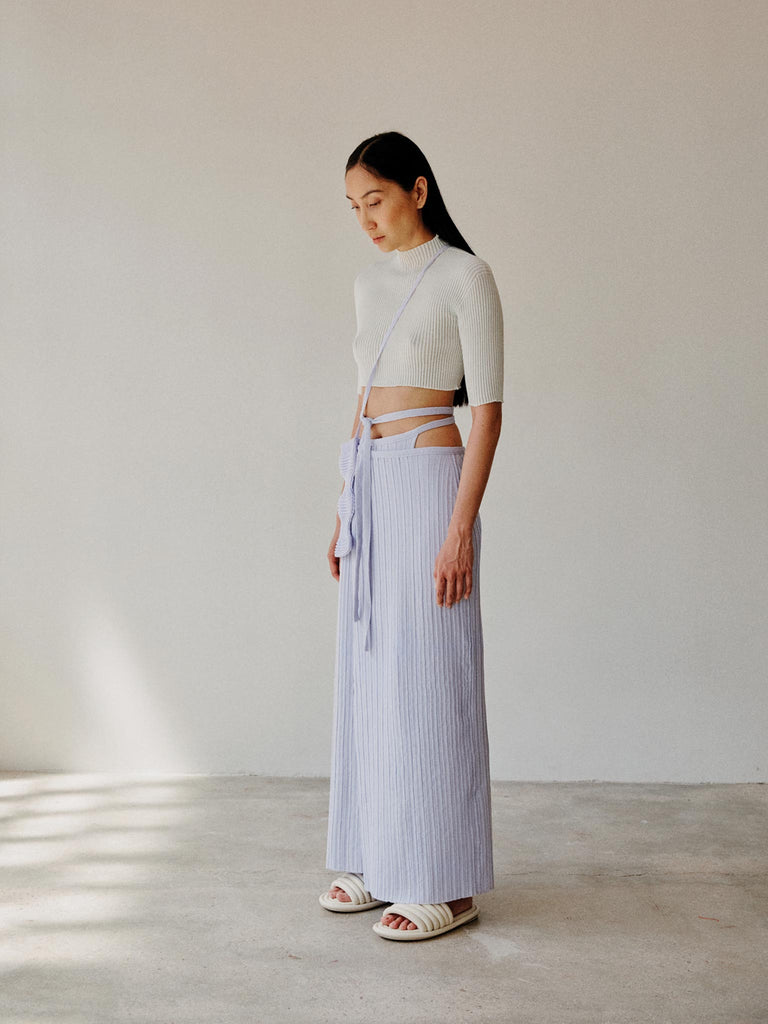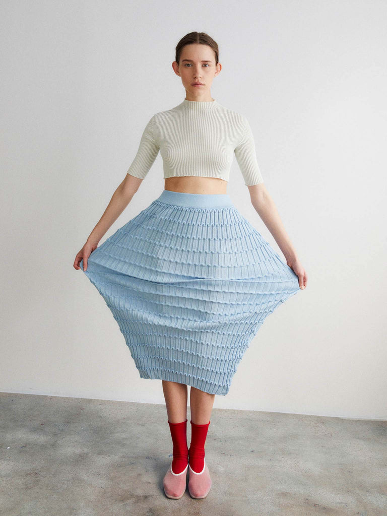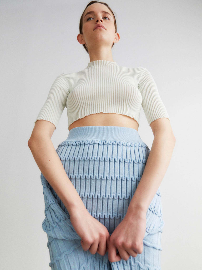 Ribbed mock-neck top Regular priceRibbed second-skin knit crafted from a ultrafine makò cotton blend with a dry handfeel. Featuring a cropped silhouette, seamless mock-neck, fitted body and skinny sleeves. Crafted with whole-garment technology.