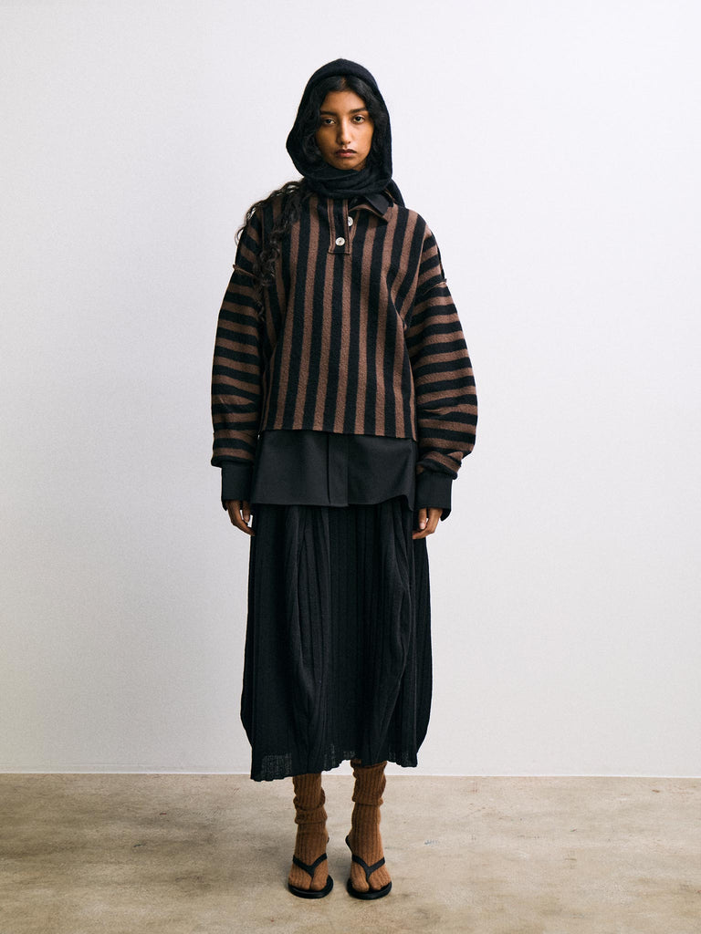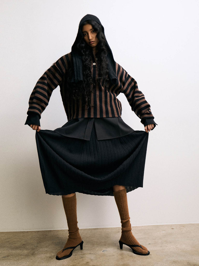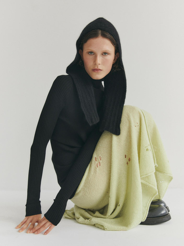 Regular priceRibbed hood-scarf knitted from a fuzzy alpaca-wool blend yarn featuring extended trims at sides to be tied under the chin or worn loose.