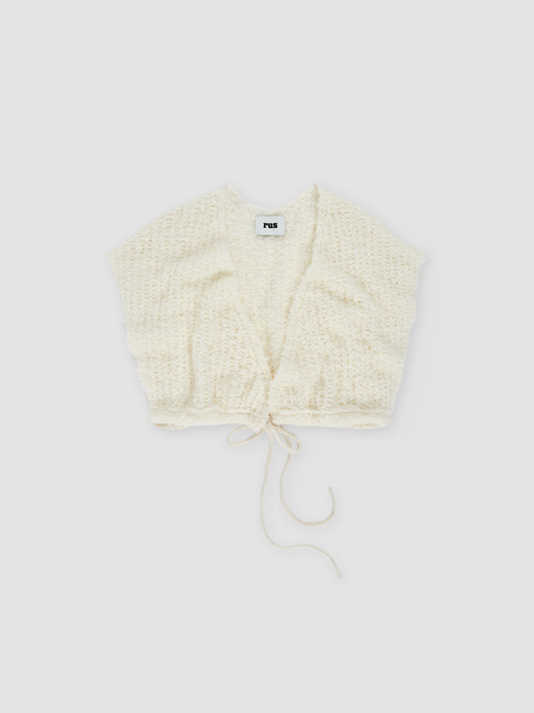 Ribbed crop vest knitted from a chunky, soft, and textured wool blend. It features a wraparound self-tie belt, allowing for versatile styling options. Perfect for layering.