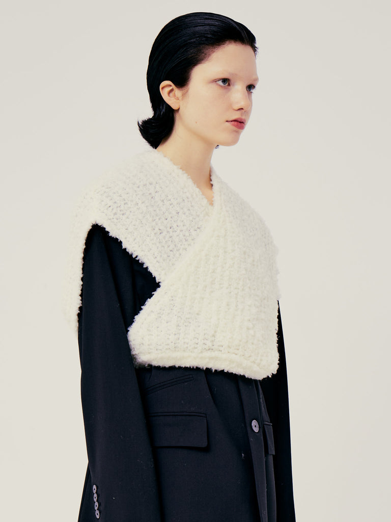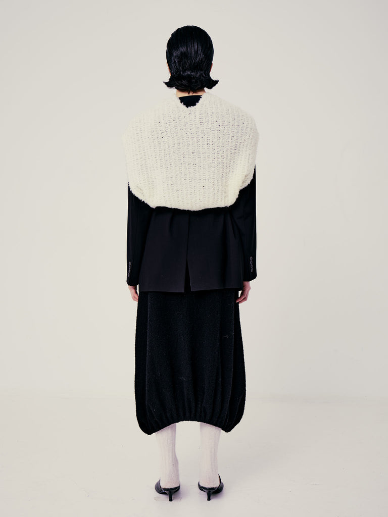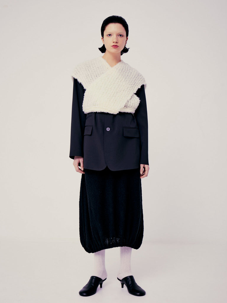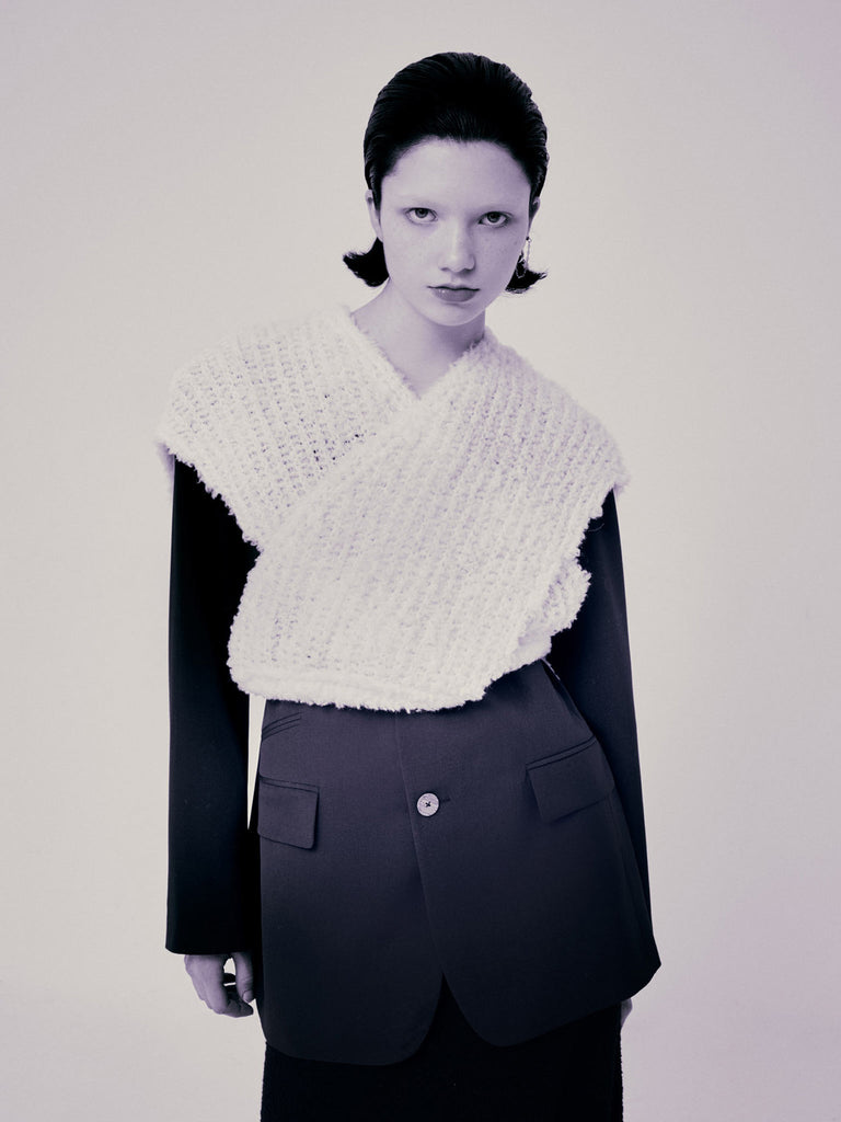Wool wrap vest Regular priceRibbed crop vest knitted from a chunky, soft, and textured wool blend. It features a wraparound self-tie belt, allowing for versatile styling options. Perfect for layering.
