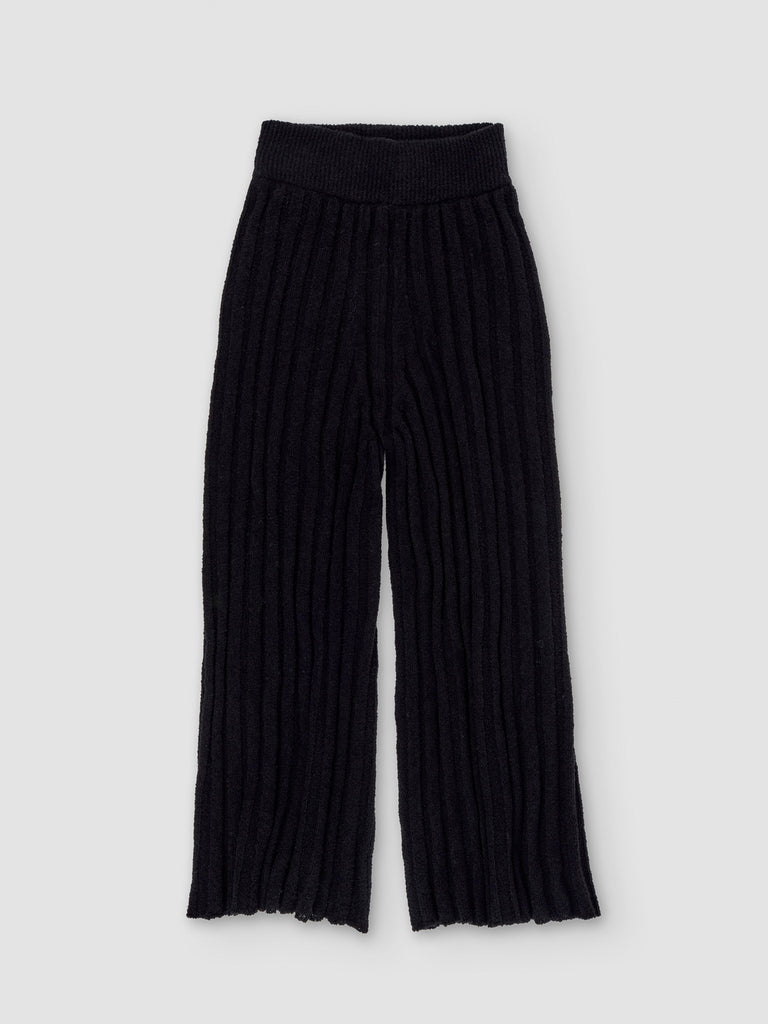 Wide leg ribbed pant with a pleated look, knitted from soft and lightweight wool bouclé. Ribbed elasticated waistband and fully-fashioned details.