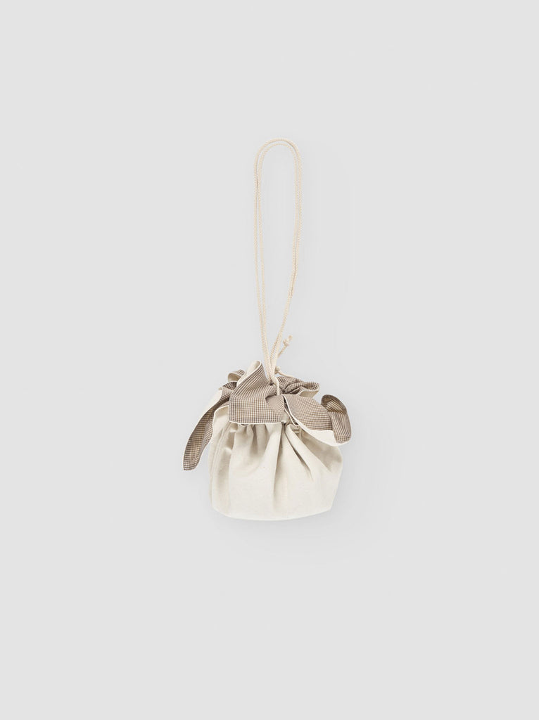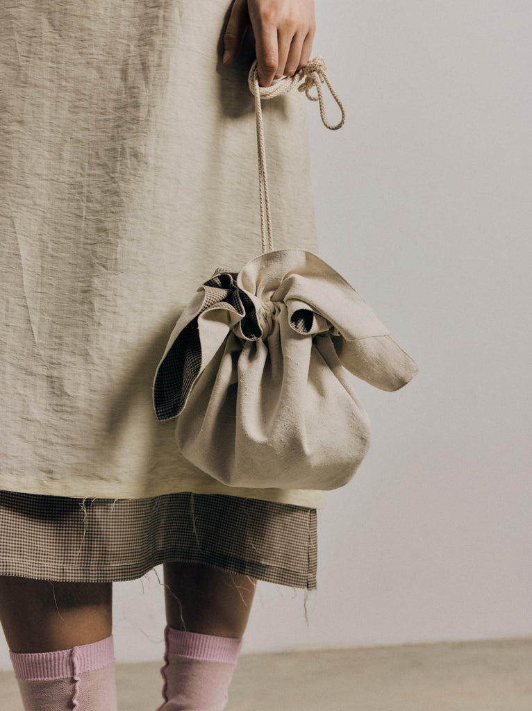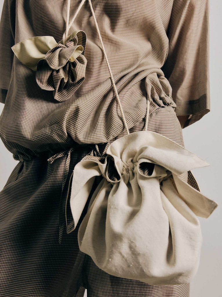Reversible pouch crafted in textured recycled cotton and linen, paired with a cotton-silk gingham lining. Features an adjustable strap that can be worn over the shoulder or tied around the waist, finished with a drawstring closure.