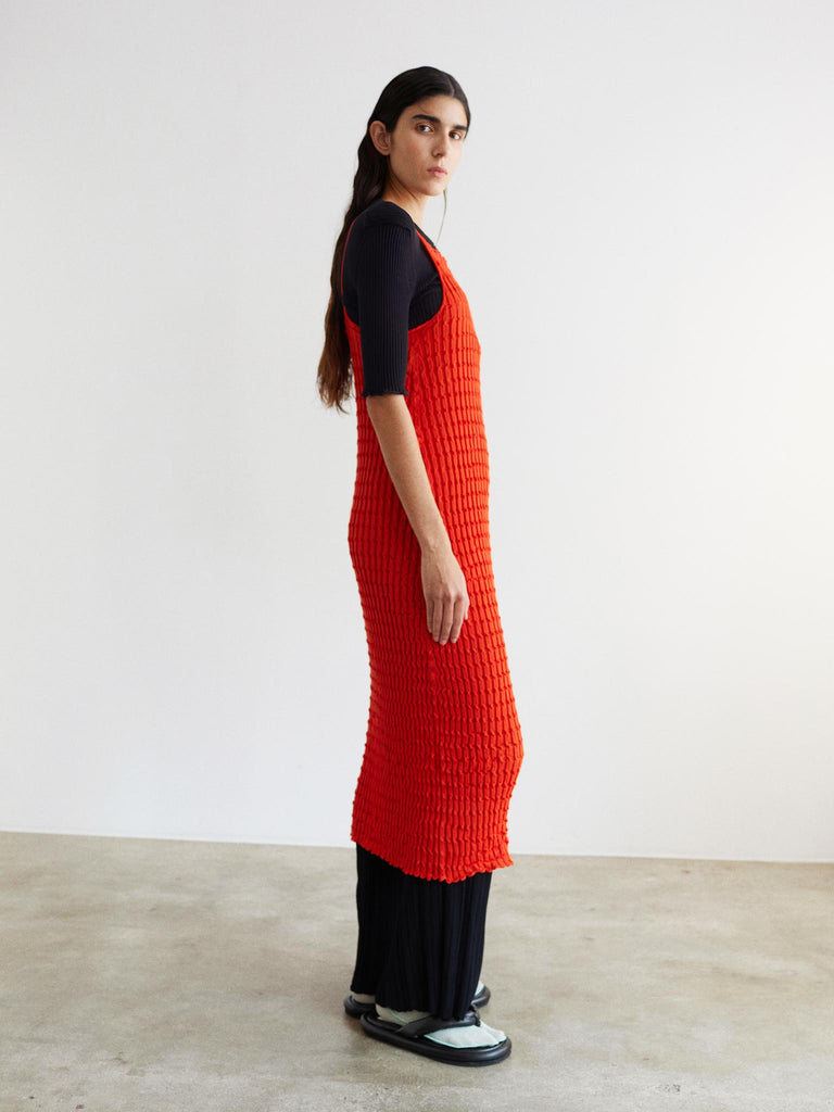 Lightweight midi dress crafted from an ultrafine makò cotton blend with a dry handfeel. Knitted in a textured ribbed stitch that creates a pleated look all over. Featuring a square neckline and fixed spaghetti straps.