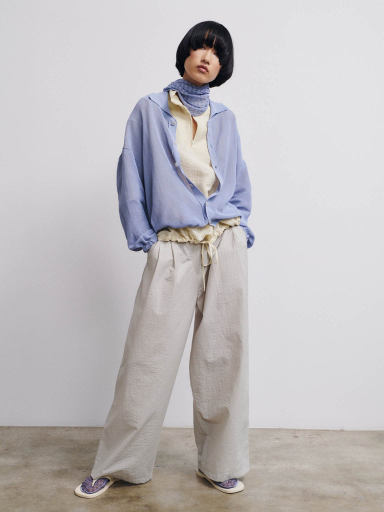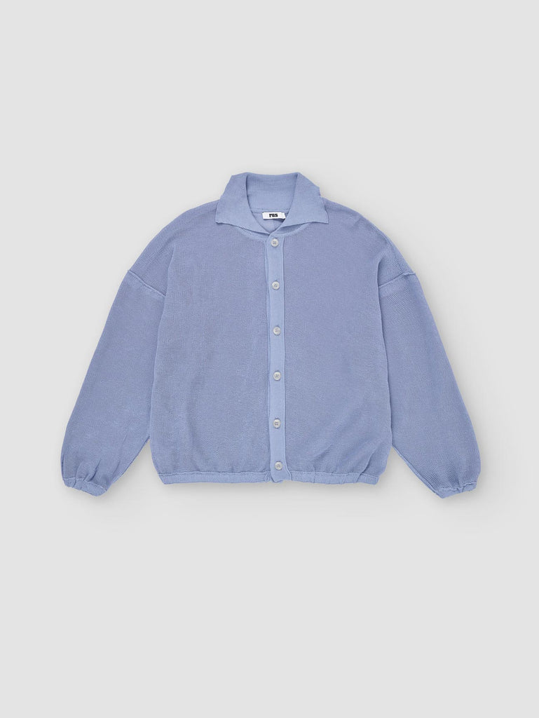 Boxy semi-sheer cardigan crafted from a corded organic cotton yarn with a dry handfeel in a mesh texture. Relaxed silhouette with a ribbed pointed collar and buttoned front placket. Featuring a puffed effect on the body and sleeves with elasticated hems.