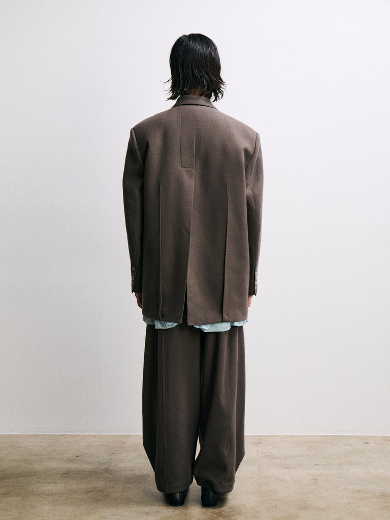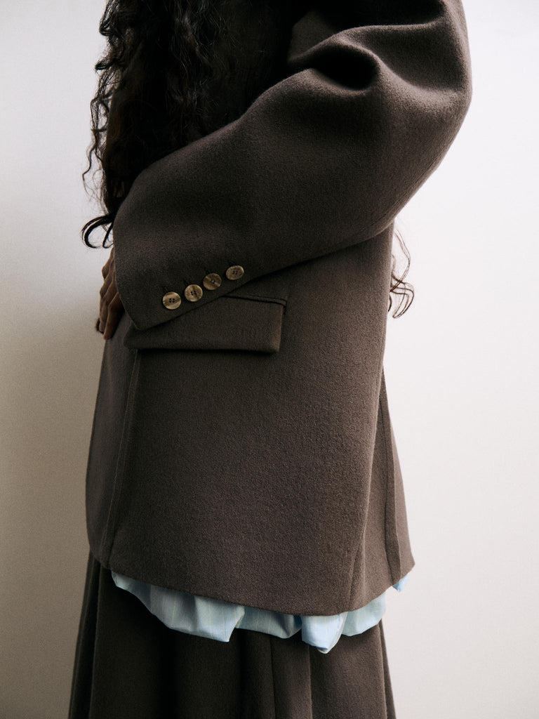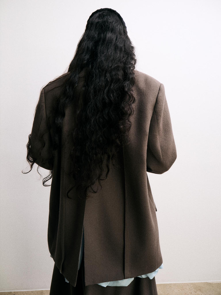 Wool tailored jacket Regular priceSingle-breasted suit jacket in virgin wool, with a papery cotton lining that peeks through the hem. Features a center-front button closure, front flap pockets, inverted visible darts, and a central back slit. Cut for a relaxed fit with wide shoulders and a below-hip length.