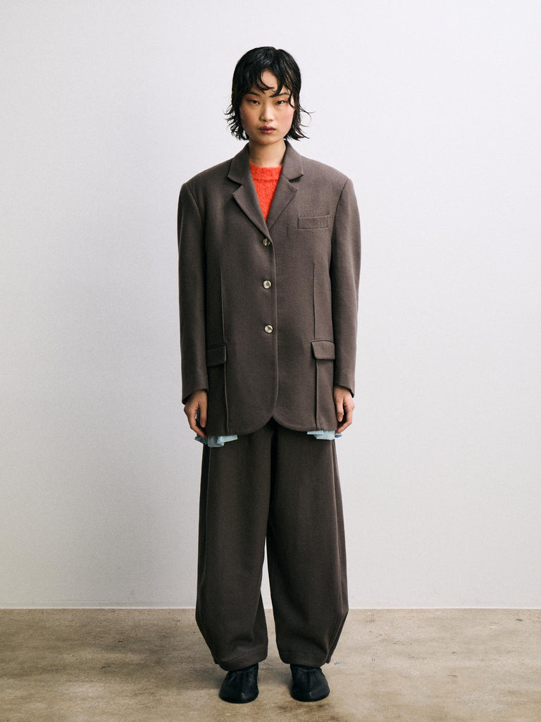 Single-breasted suit jacket in virgin wool, with a papery cotton lining that peeks through the hem. Features a center-front button closure, front flap pockets, inverted visible darts, and a central back slit. Cut for a relaxed fit with wide shoulders and a below-hip length.