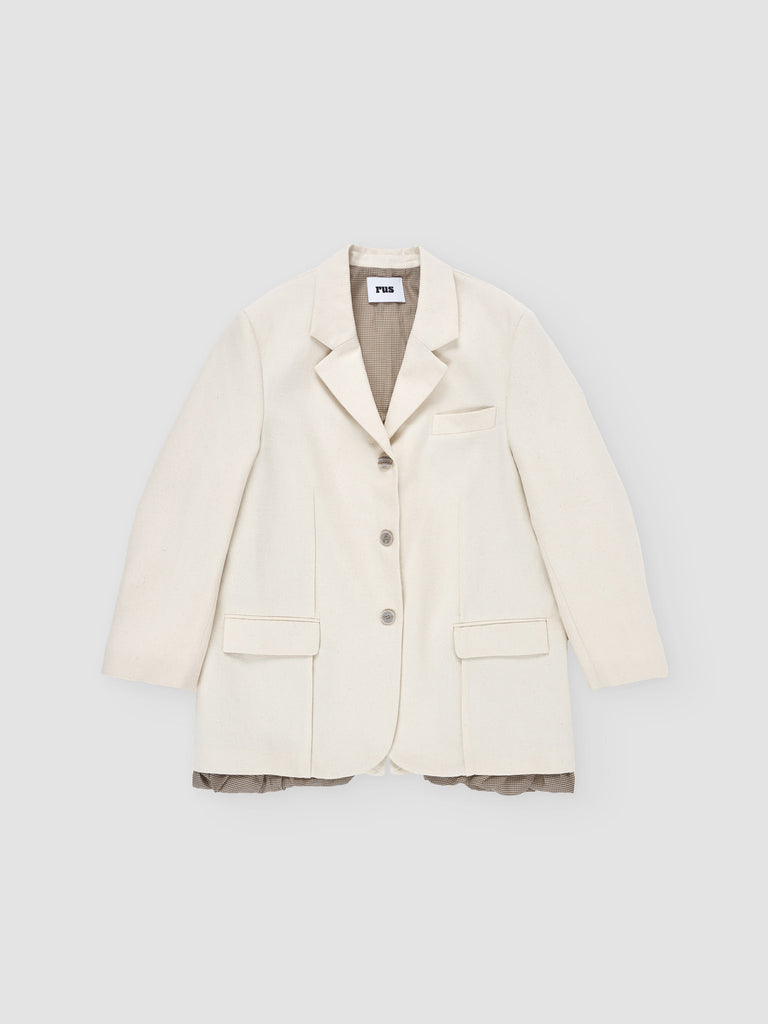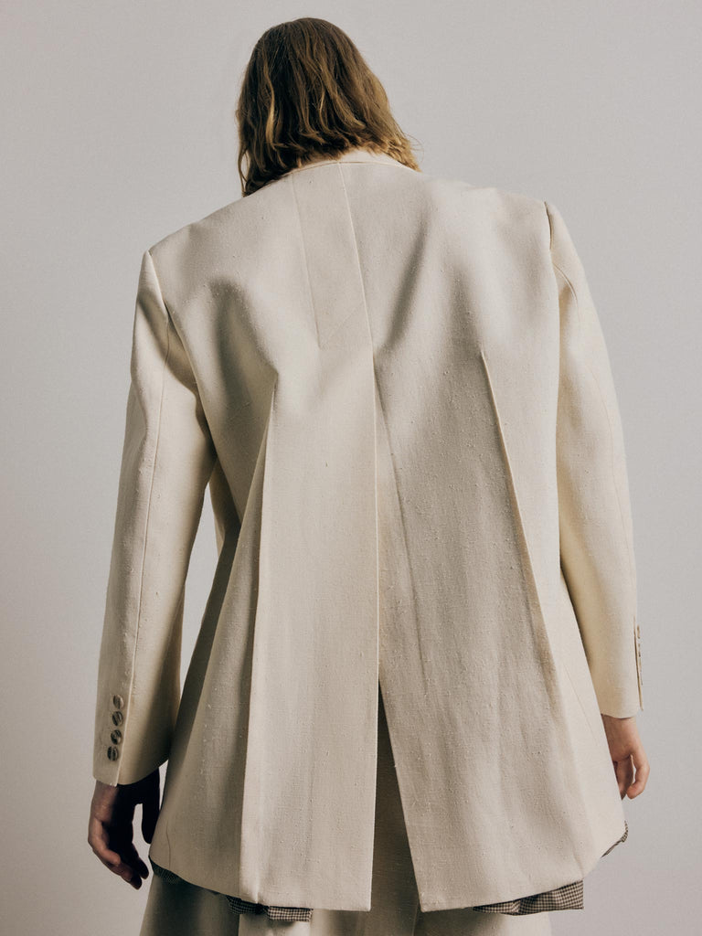Single-breasted suit jacket crafted in textured recycled cotton and linen, with a cotton silk gingham lining that peeks through the hem. Features a center-front button closure, front flap pockets, inverted visible darts, and a central back slit. Cut for a relaxed fit with wide shoulders and a below-hip length.