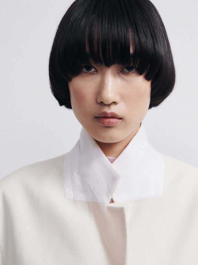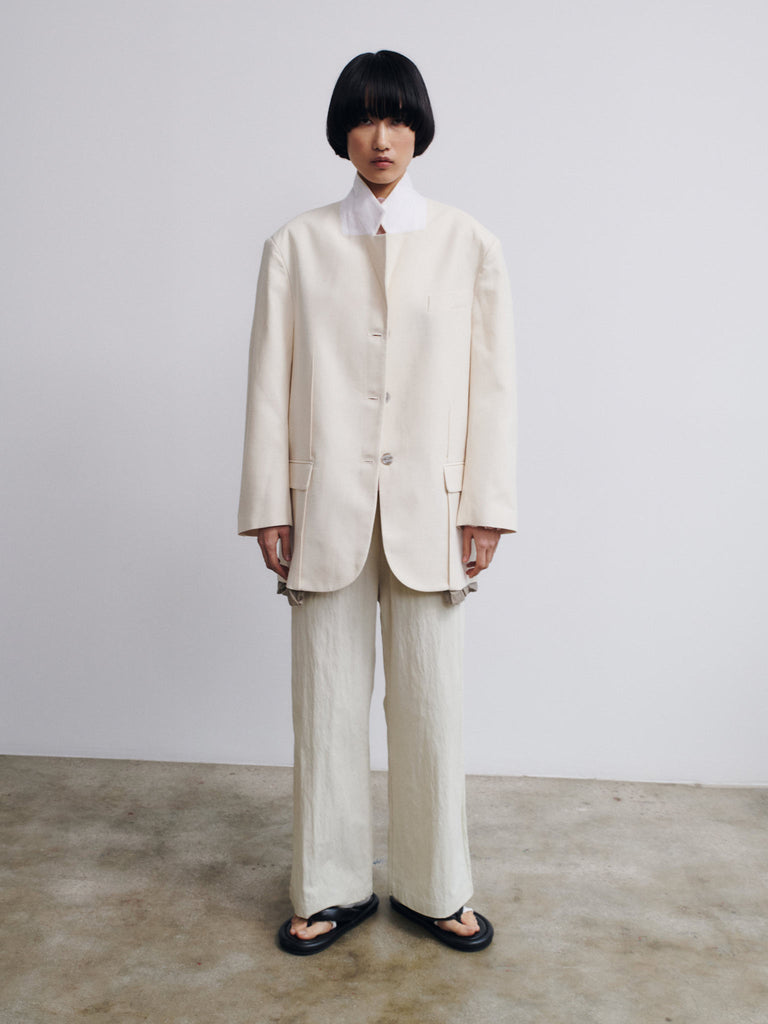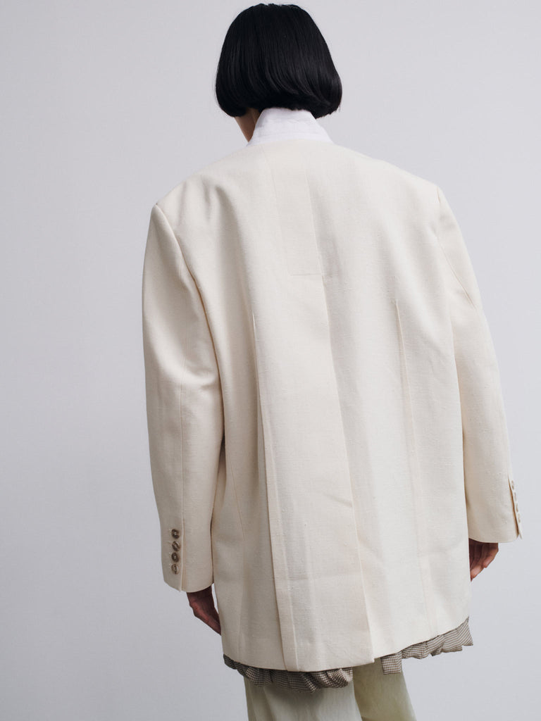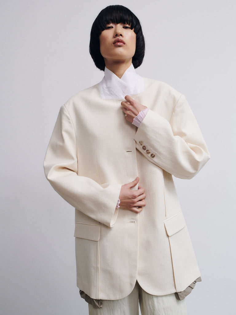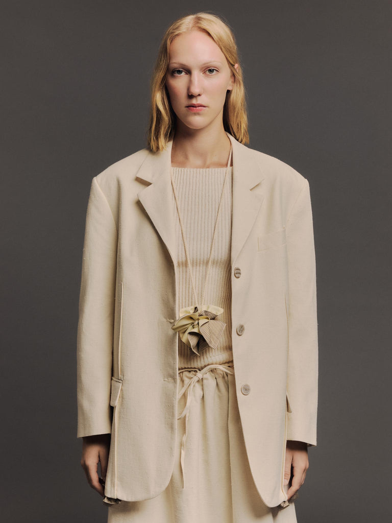 Cotton-linen blend tailored jacket Regular priceSingle-breasted suit jacket crafted in textured recycled cotton and linen, with a cotton silk gingham lining that peeks through the hem. Features a center-front button closure, front flap pockets, inverted visible darts, and a central back slit. Cut for a relaxed fit with wide shoulders and a below-hip length.