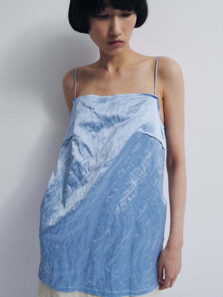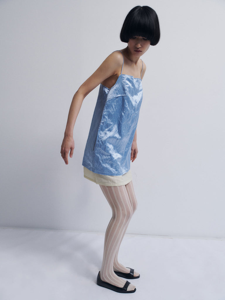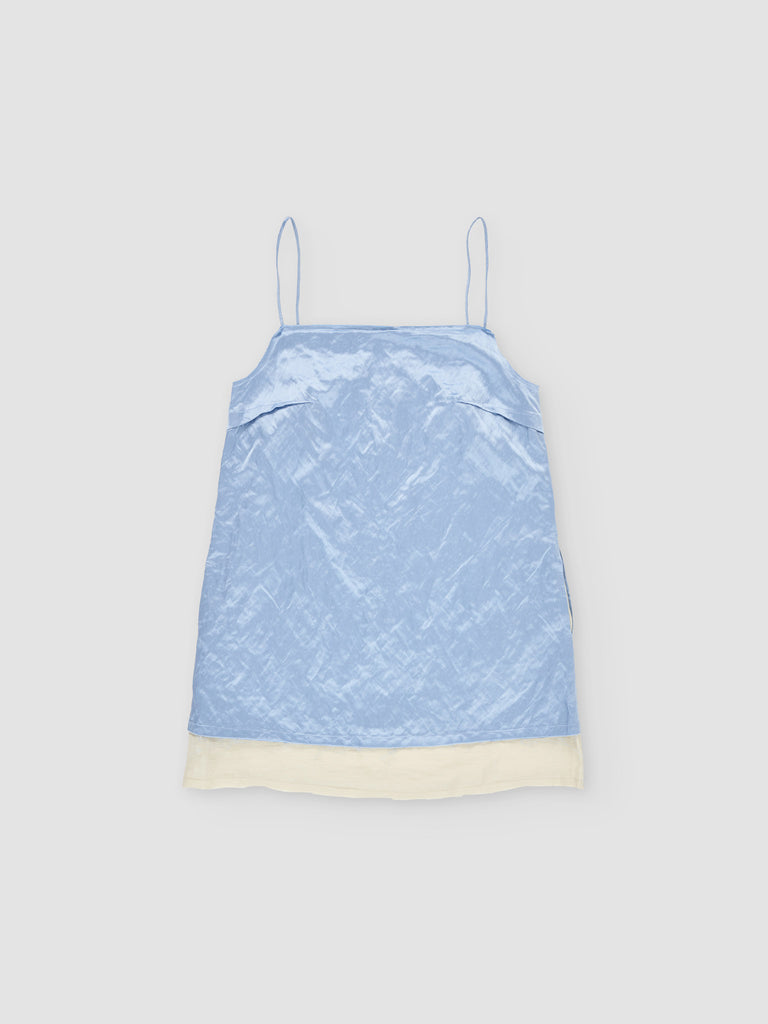 Layered mini-dress Regular priceLayered mini dress crafted from satin with metallic fibers, giving it a subtle lived-in texture, paired with a textured linen inner layer. Features a straight neckline, spaghetti straps, side pockets, frayed edges at the neckline and hem, and exposed darts. The outer layer sits slightly shorter than the inner layer, creating a layered effect. Perfect for layering or wearing alone.
